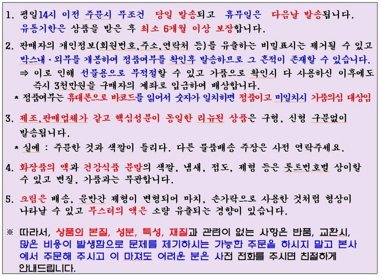- ㆍ모니터 해상도의 차이로 인해 색상이나 이미지가 실제와 달라, 고객이 단순 변심으로 교환/반품을 무료로 요청하는 경우