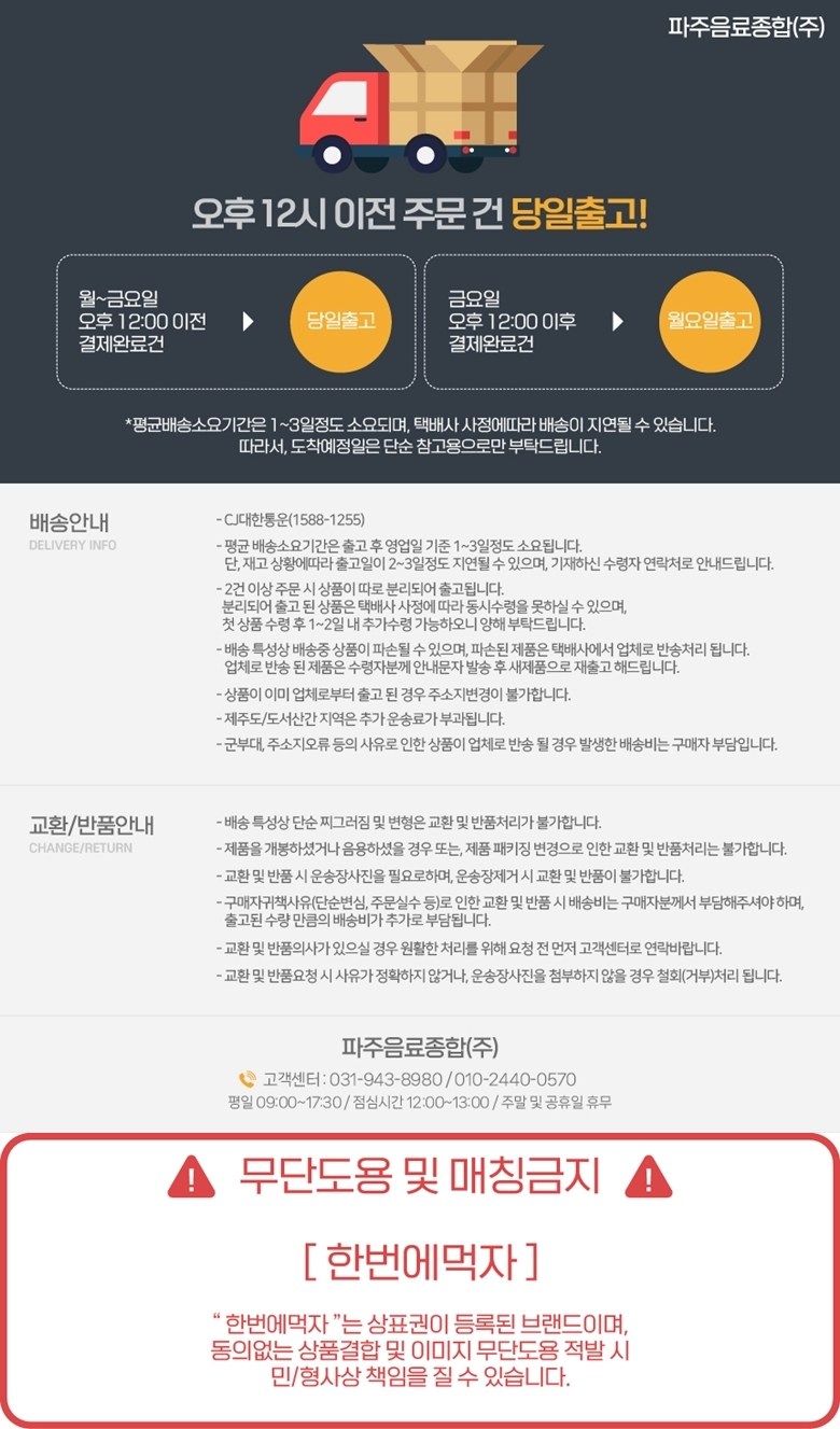 | 배송기간 | ㆍ도서산간 지역 등은 배송에 3-5일이 더 소요될 수 있습니다. - 천재지변, 물량 수급 변동 등 예외적인 사유 발생 시, 다소 지연될 수 있는 점 양해 부탁드립니다. | ||