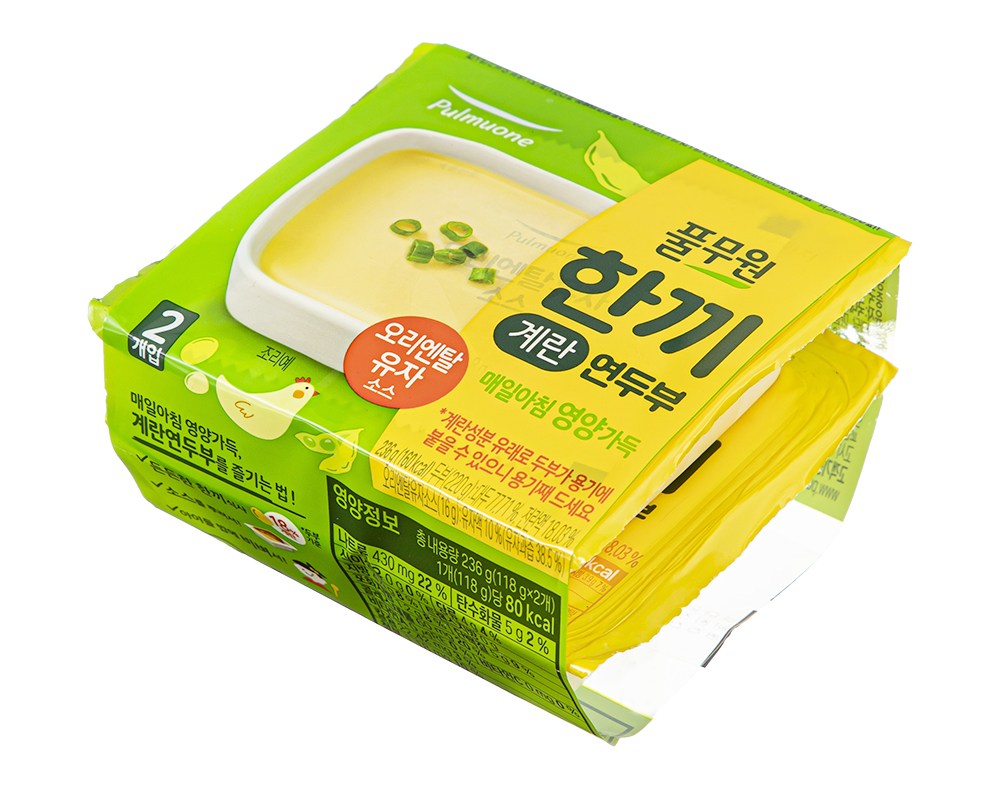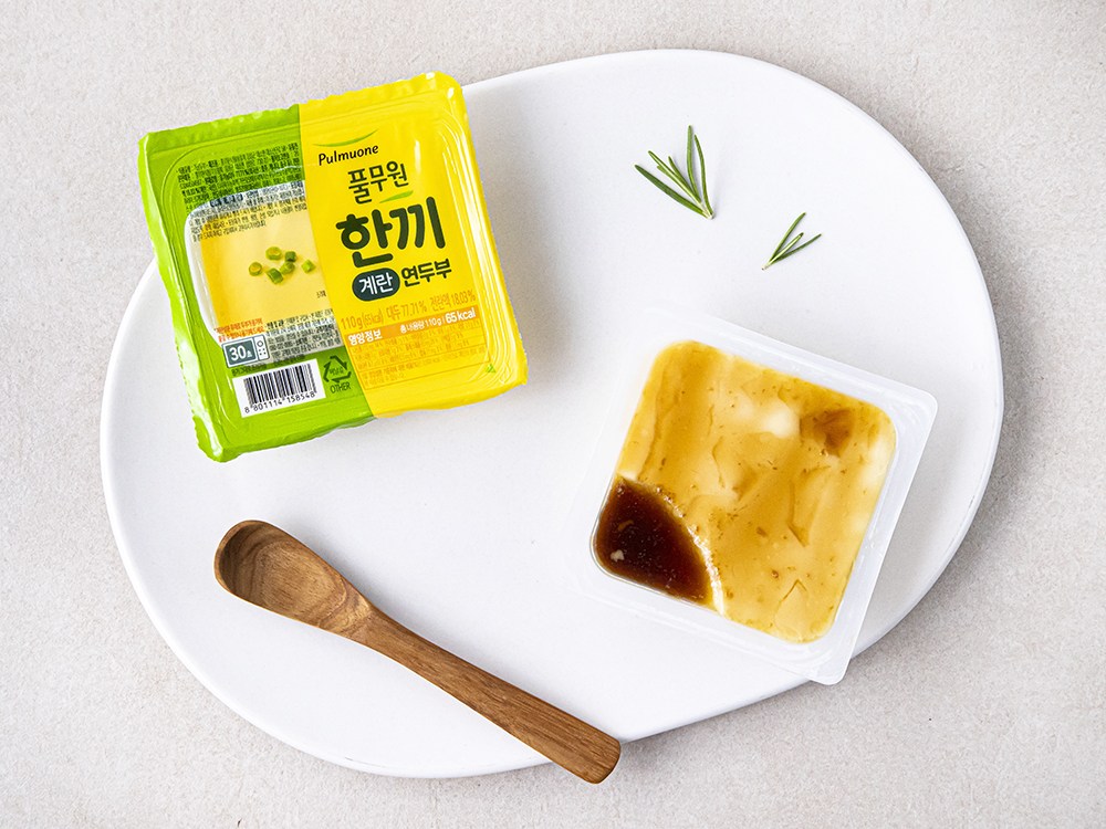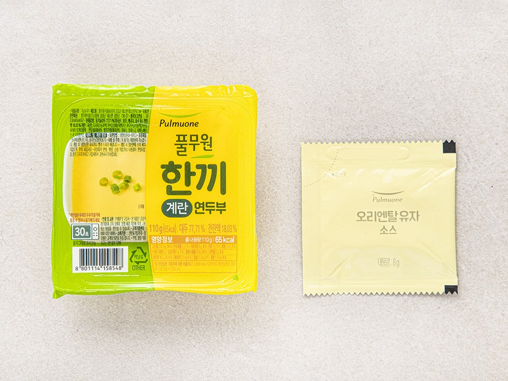 부들부들하고 촉촉한 한끼 계란 연두부예요. 대두와 전란액을 사용해 담백하고 고소한 풍미가 일품이지요. 전자레인지로 조리할 수 있어 간편하답니다. 동봉된 오리엔탈 유자소스로 새콤하고 짭조름한 감칠맛을 더해 즐겨보세요.