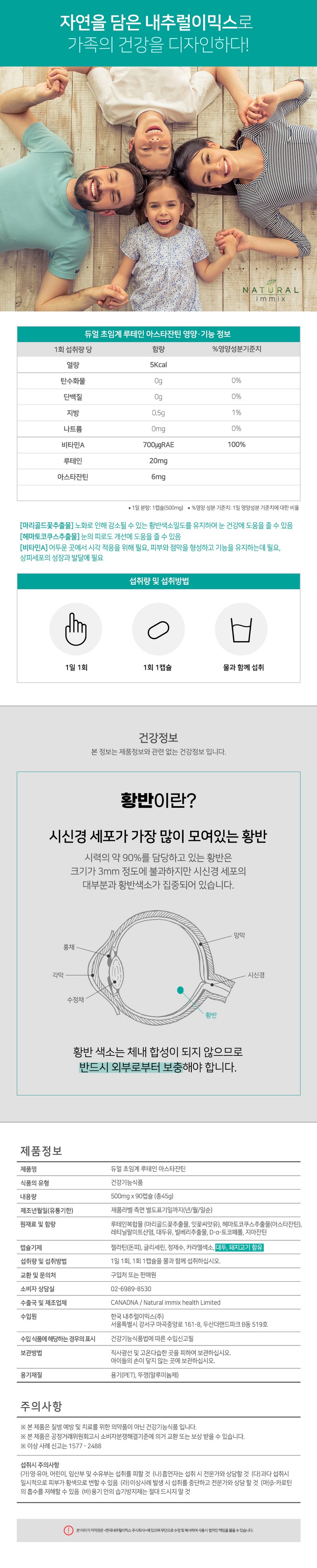 | 원료명 및 함량 | 루테인복합물(마리골드꽃추출물, 잇꽃씨앗유), 헤마토코쿠스추출물(아스타잔틴), 레티닐팔미트산염, 대두유, 빌베리추출물, D-α-토코페롤, 지아잔틴 | 영양정보 | 1일 분량: 1캡슐(500mg), 열량 5kcal, 탄수화물 0g, 단백질 0g, 지방 0.5g(1%), 나트륨 0mg, 비타민A 700ug RAE(100%), 루테인 20mg, 아스타잔틴 6mg, % 영양 성분 기준치: 1일 영양성분 기준치에 대한 비율 |