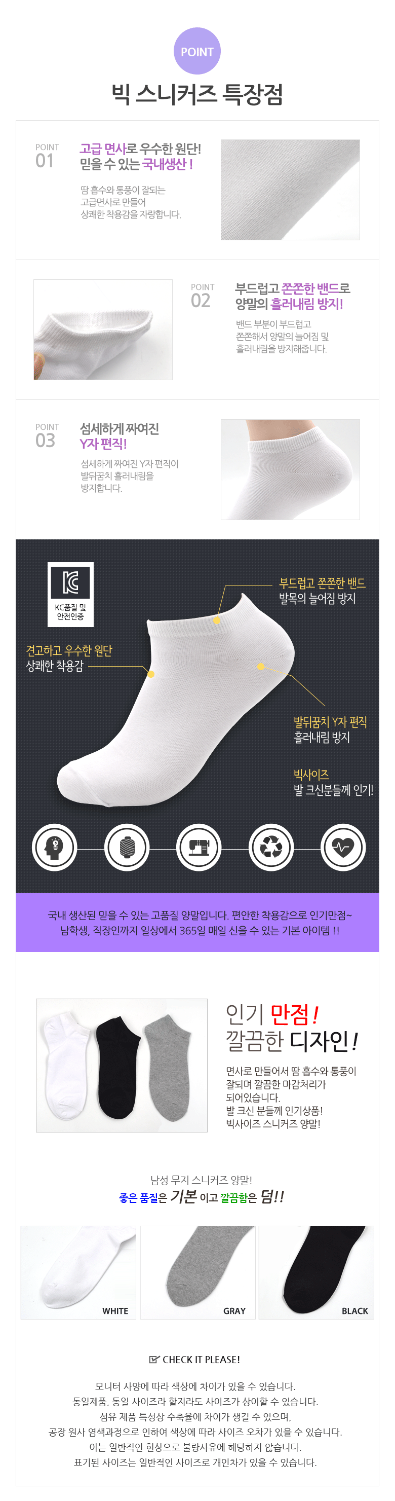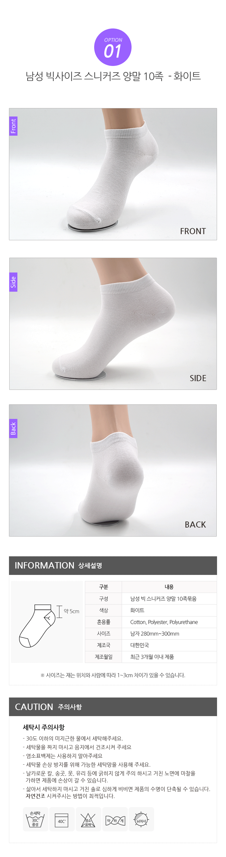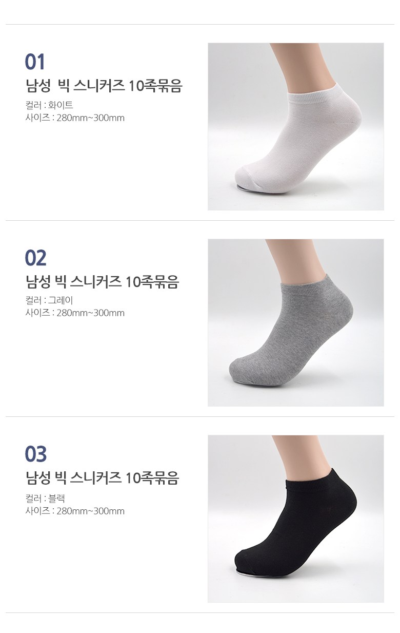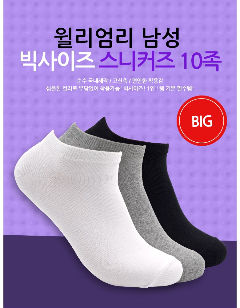 | 종류 | 남성 빅사이즈 스니커즈 양말 | 소재 | 면,폴리에스테르,폴리우레탄 |