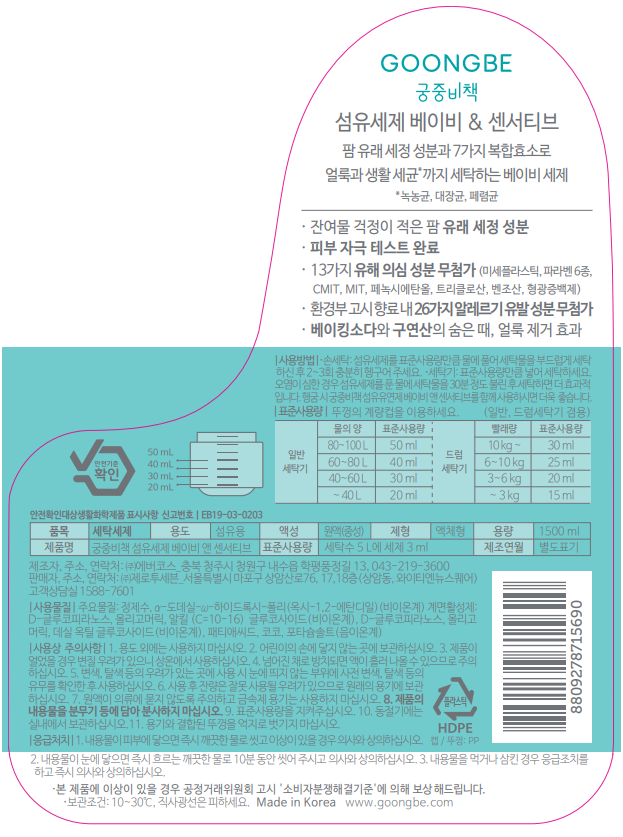 | 품목 및 제품명 | 세탁세제 / 궁중비책 섬유세제 베이비 앤 센서티브 | 용도(표백제의 경우 계열을 함께표시) 및 제형 | 섬유용 / 비분사형-액체형 |
