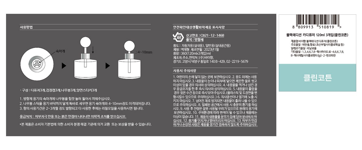 | 품목 및 제품명 | 방향제 / 바이향 블랙에디션 디퓨저(클린코튼) | 용도(표백제의 경우 계열을 함께표시) 및 제형 | 자동차용 (실내용),일반용(실내공간용) / 액체형 |