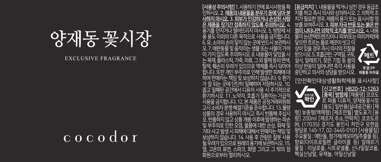 | 품목 및 제품명 | 방향제 / 코코도르 퍼퓸 디퓨저_양재동꽃시장 | 용도(표백제의 경우 계열을 함께표시) 및 제형 | 일반용(실내공간용) / 보충형(액체형) |
