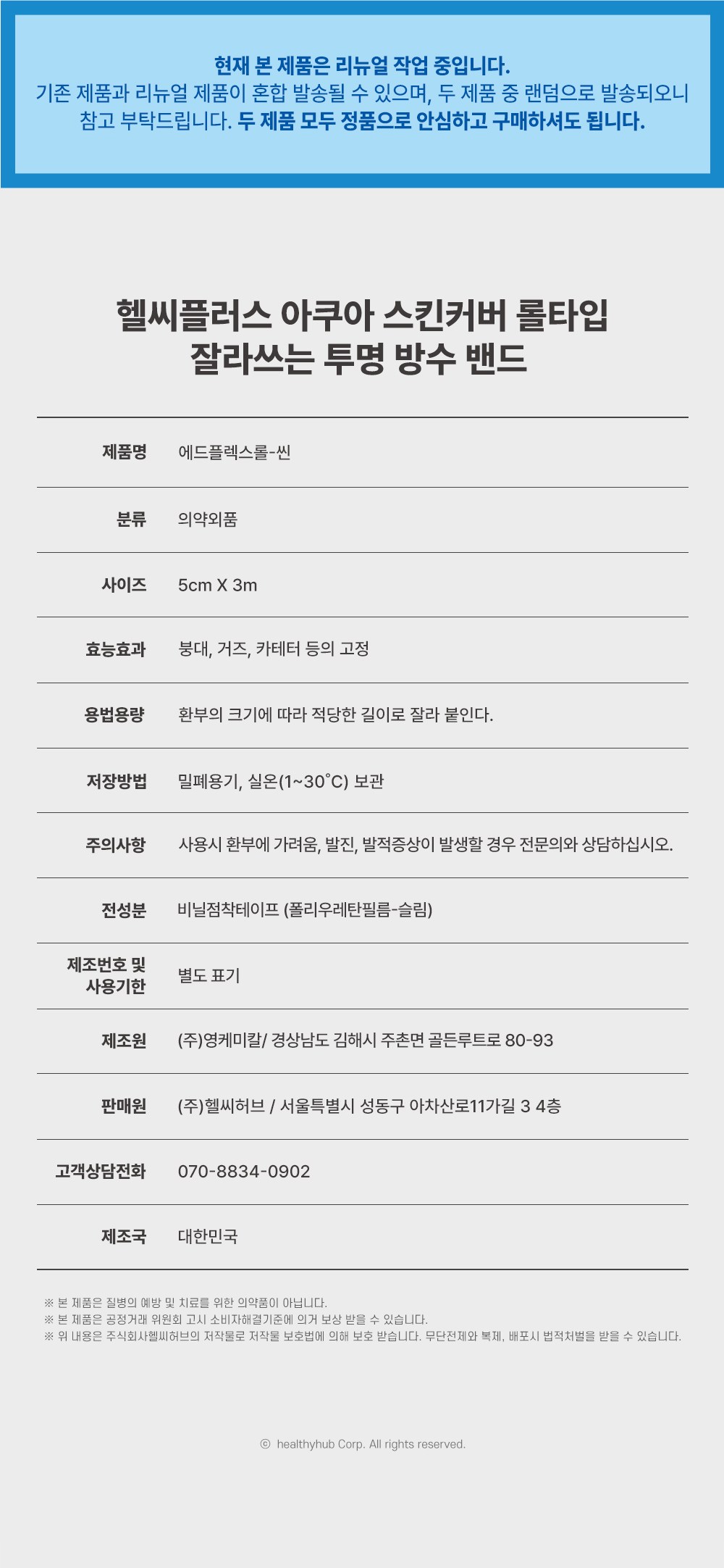| 제조국(원산지) | 대한민국 | 제조자(수입자) | 리뉴얼 전: ㈜밴드골드 / 리뉴얼 후: ㈜영케미칼 |