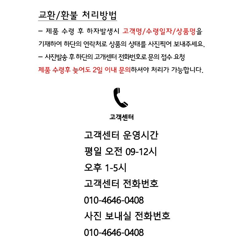 - ㆍ모니터 해상도의 차이로 인해 색상이나 이미지가 실제와 달라, 고객이 단순 변심으로 교환/반품을 무료로 요청하는 경우