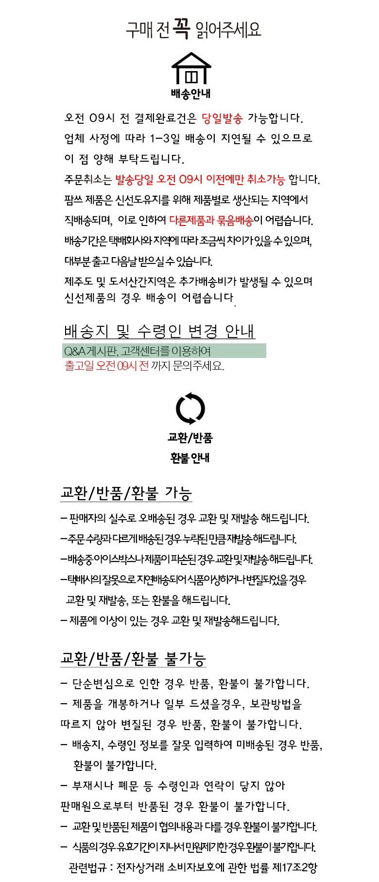 | 배송방법 | 신선/냉장/냉동 | 배송비 | 무료배송 - 도서산간 지역 배송불가 |