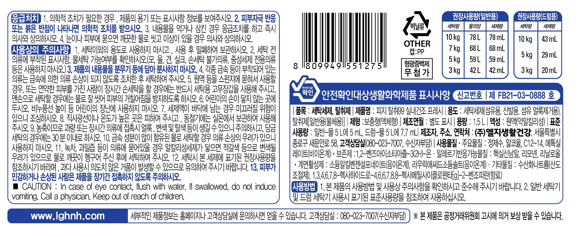 | 품목 및 제품명 | 세탁세제, 탈취제 / 피지 탈취99 실내건조 프레시 | 용도(표백제의 경우 계열을 함께표시) 및 제형 | 섬유용,신발용,섬유 얼룩제거용,일반용-물체용 / 보충형(액체형) |