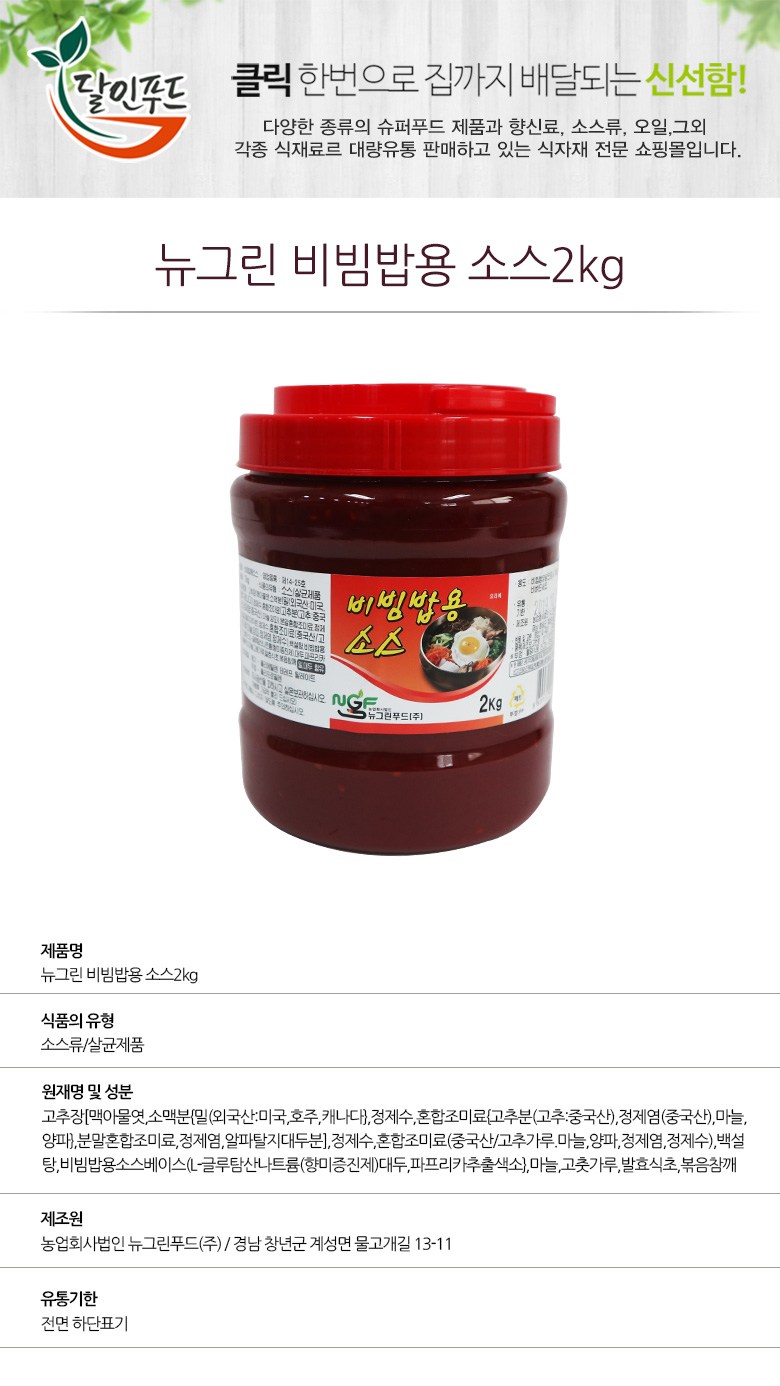 | 제품명 | 뉴그린 비빔밥용 소스2kg | 식품의 유형 | 소스류/살균제품 |