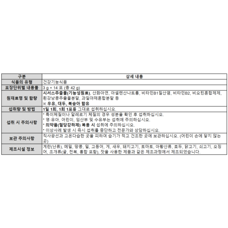 | 원료명 및 함량 | 상품 상세페이지 참조 | 영양정보 | 상품 상세페이지 참조 |