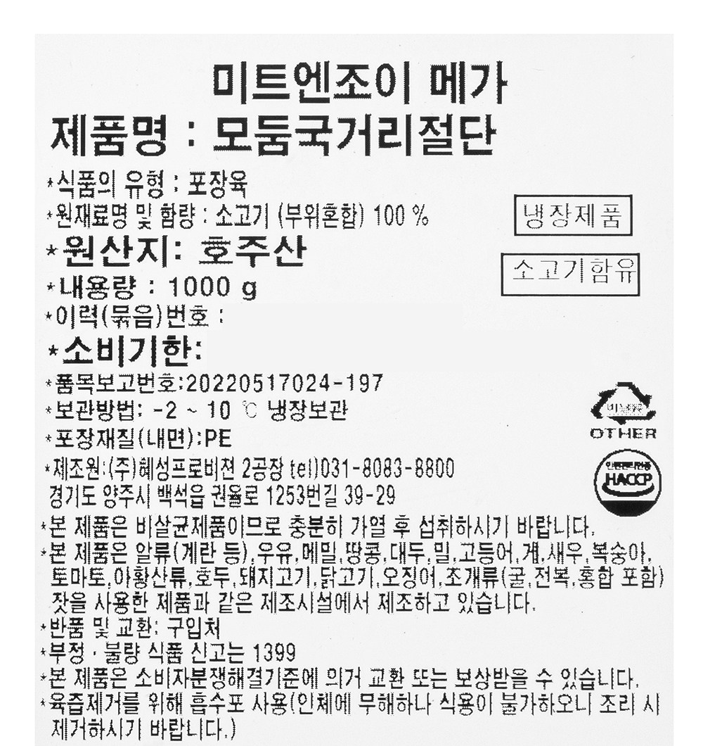 | 제조연월일, 소비기한 또는 품질유지기한 | 소비기한(또는 유통기한) : 2026년 03월 05일 이거나 그 이후인 상품 제조년월일 : 2026년 02월 26일 이후인 제조상품 | 세부 품목군별 표시사항 | 축산물 등급표시 : 해당 없음 / 이력번호 표시유무 : 이력번호 표시제품임 |
