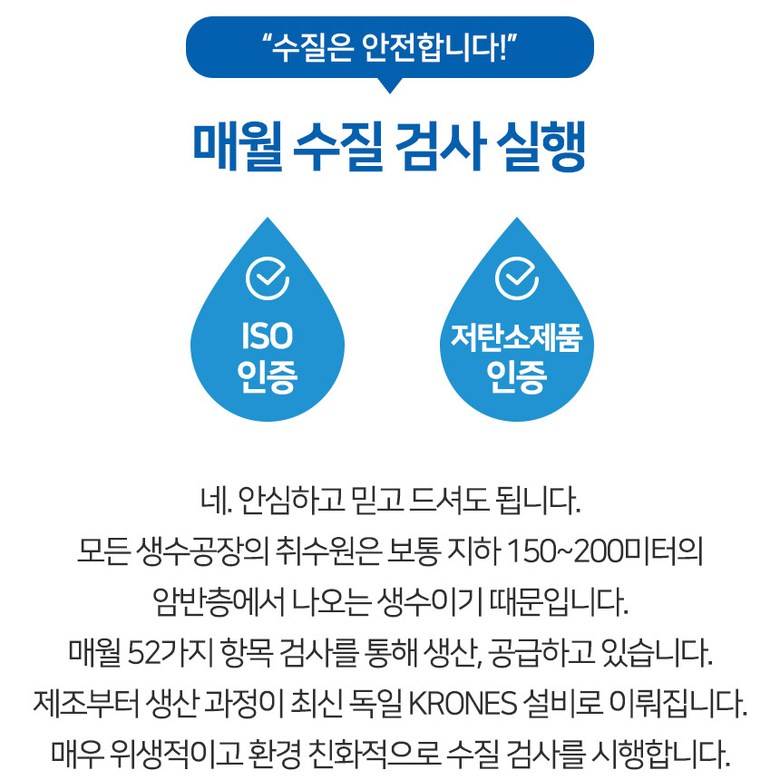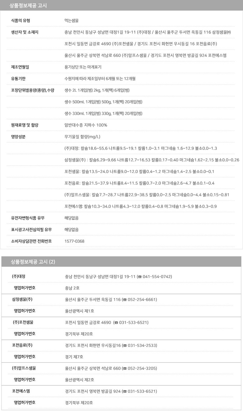 | 생산자 및 소재지 | 충남 천안시 동남구 성남면 대정1길 19-11 (주)대정 / 울산시 울주군 두서면 옥동길 116 삼정샘물㈜ / 포천시 일동면 금강로 4690 (주)포천샘물*대정 연락처: 041-554-0742*삼정샘물 연락처: 052-264-7766*포천샘물 연락처: 031-533-6521 | 제조연월일, 소비기한 또는 품질유지기한 | 제조연월일:용기상단 또는 마개표기유통기한:제조일부터 6개월 |