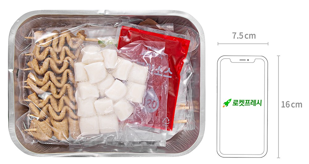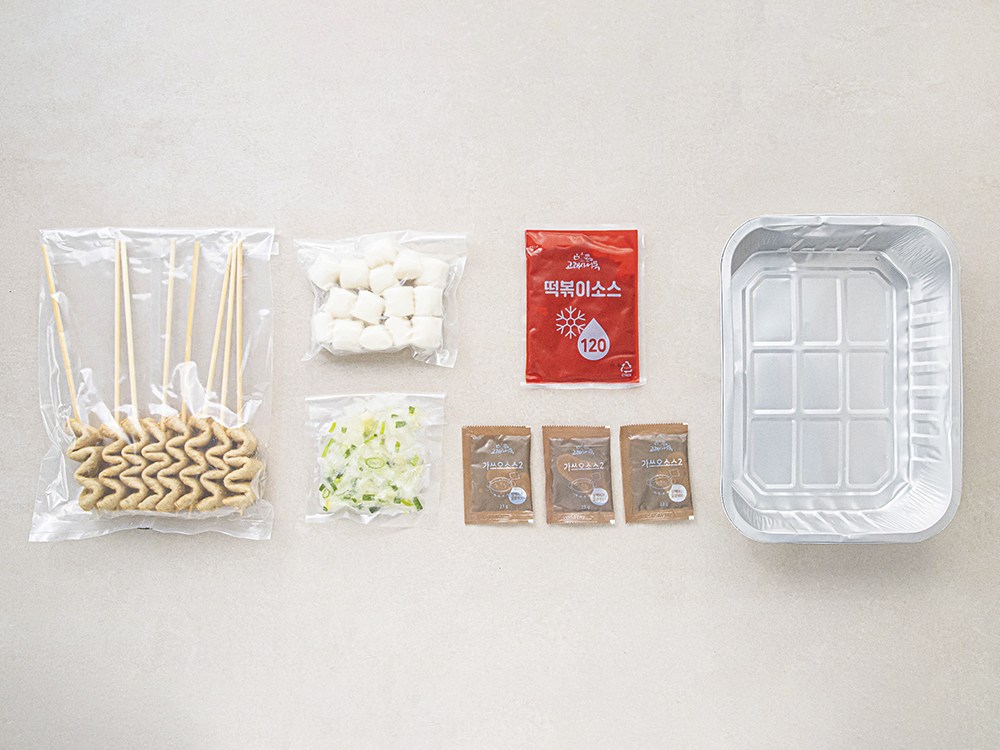 어묵, 가래떡, 양파 대파 혼합야채, 떡볶이소스, 가쓰오소스, 직화용기로 구성되어 있습니다.