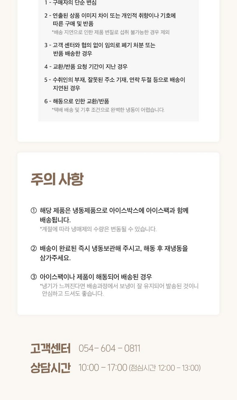 | 계절상품/식품/화장품 | ㆍ신선/냉장/냉동 상품의 단순변심의 경우 ㆍ뷰티 상품 이용 시 트러블(알러지, 붉은 반점, 가려움, 따가움)이 발생하는 경우, |