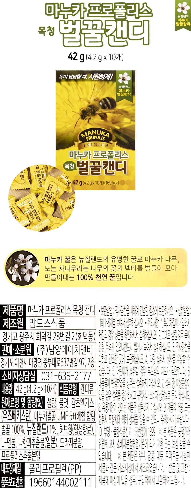 | 제품명 | 마누카 프로폴리스캔디 | 식품의 유형 | 상품 상세페이지 참조 |