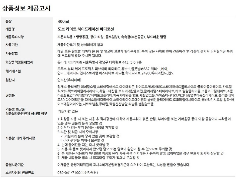 ▶ 도브 라이트 하이드레이션 바디로션 400ml