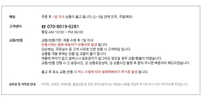 - ㆍ모니터 해상도의 차이로 인해 색상이나 이미지가 실제와 달라, 고객이 단순 변심으로 교환/반품을 무료로 요청하는 경우