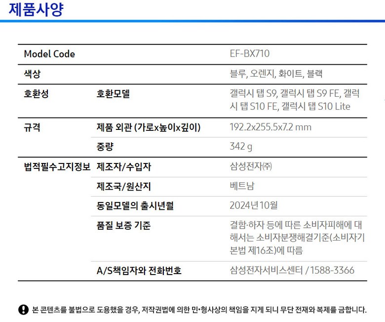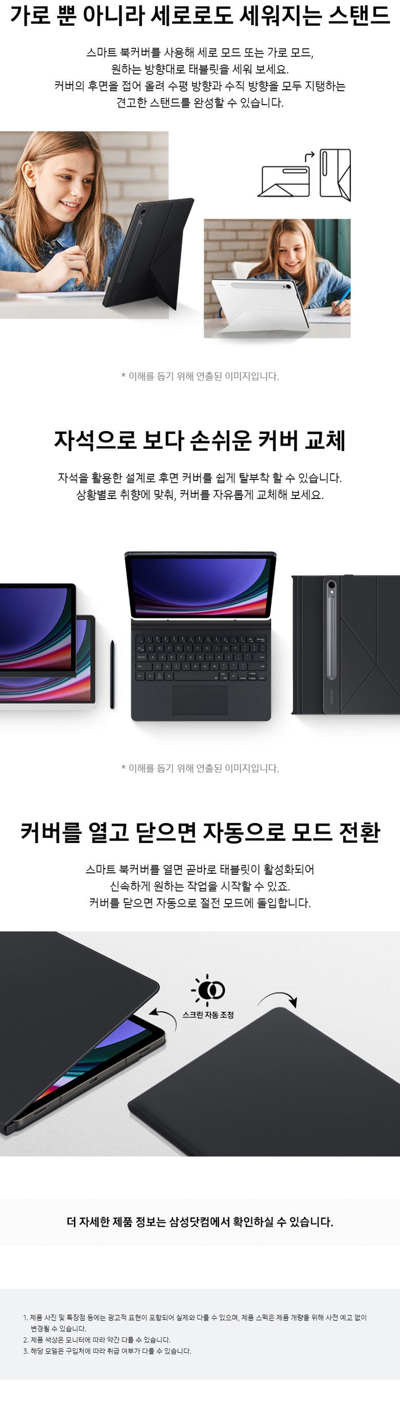 | 품명 및 모델명 | 삼성 정품 갤럭시 탭 S9 S9 FE 스마트 북커버 / EF-BX710P | 인증/허가 사항 | 상품 상세페이지 참조 |