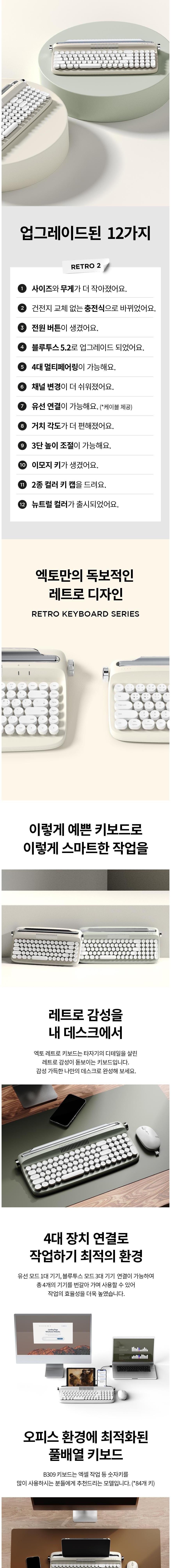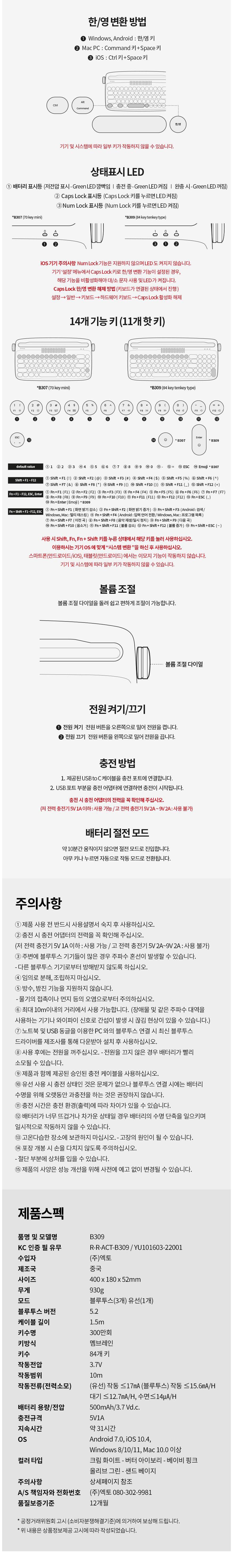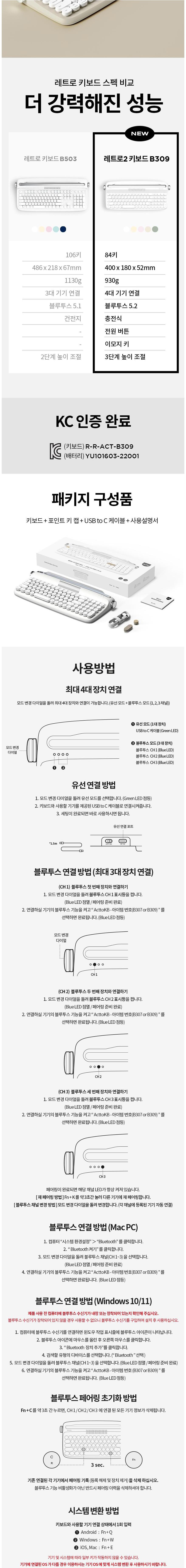 | 품명 및 모델명 | 레트로2 블루투스 키보드/B309 | KC 인증정보 | 본품: R-R-ACT-B309, 전지: YU101603-22001B |