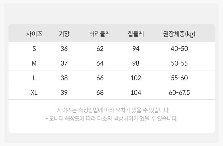 | 치수 | S(40-50KG),M(50-55KG),L(55-60KG),XL(60-67.5KG) | 제조자(수입자) | 미녹지구 |