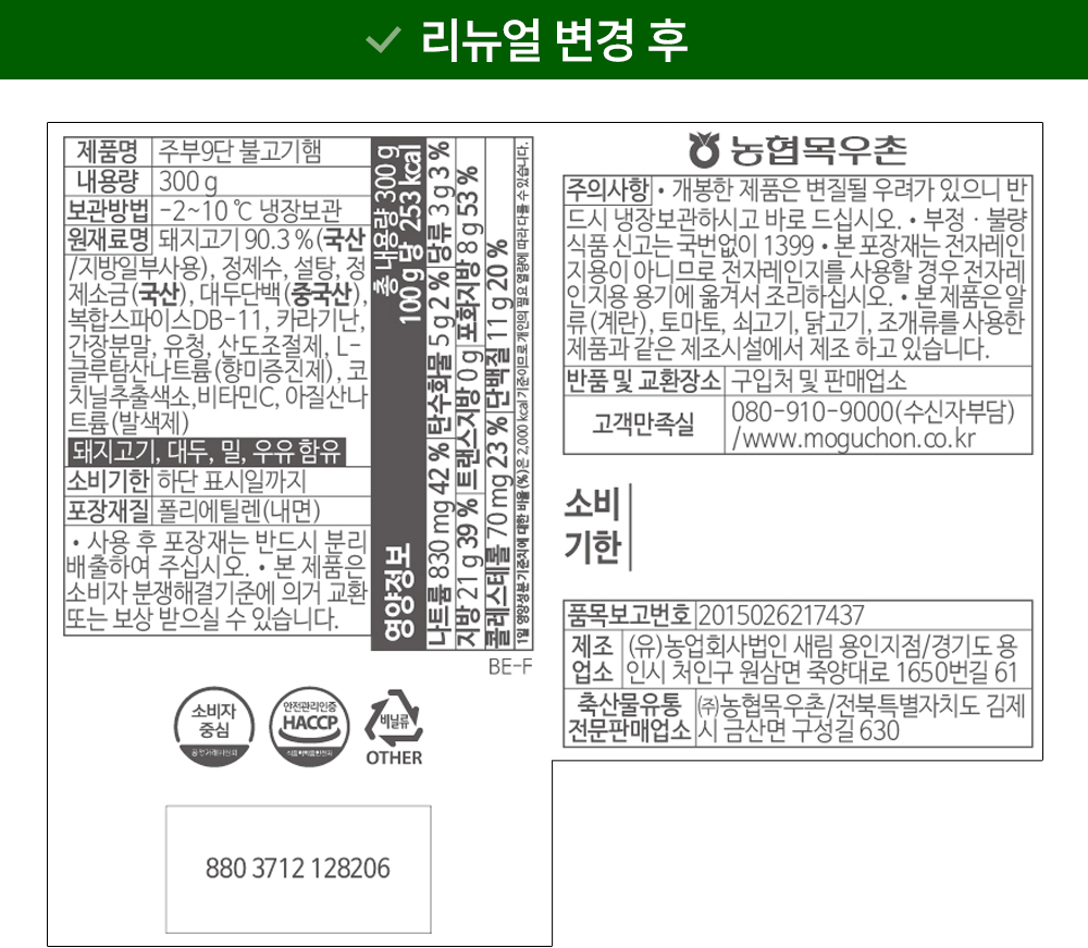 | 포장단위별 내용물의 용량(중량), 수량 | 300g x 1개 | 원재료명 및 함량 | 컨텐츠 참조 |