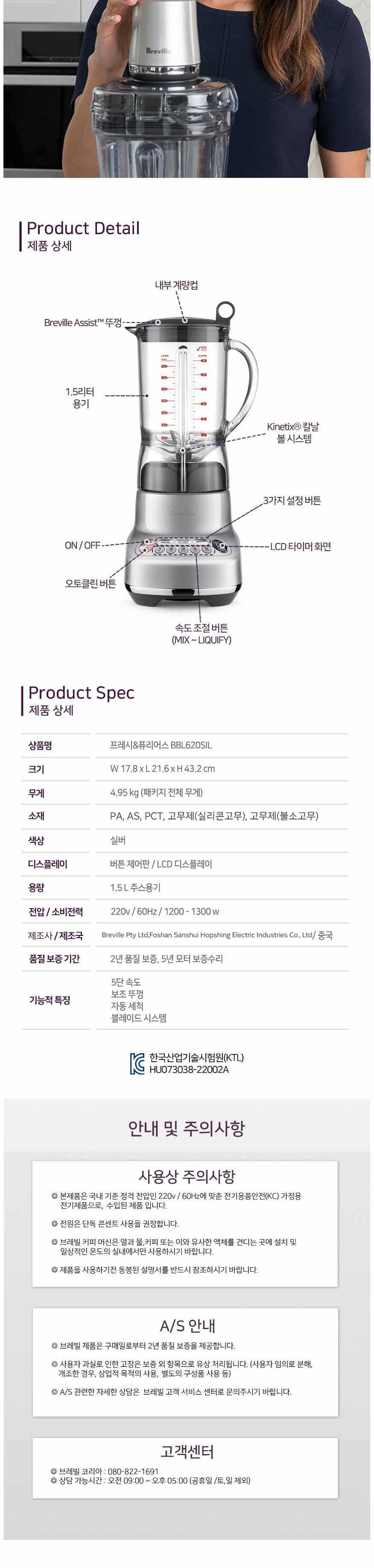 | 품명 및 모델명 | 브레빌 블렌더프레시 엔 퓨리어스 다용도 믹서기 실버 BBL620SIL (인증모델명: BBL620) | KC 인증정보 | HU073038-22002A, R-R-Brv-BBL620 |