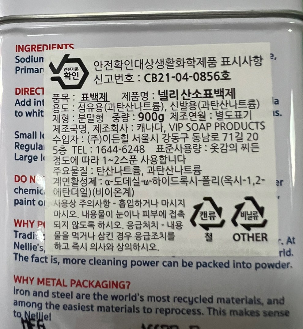 | 품목 및 제품명 | 세탁세제 / 넬리 산소표백제 | 용도(표백제의 경우 계열을 함께표시) 및 제형 | 섬유용(과탄산나트륨), 신발용(과탄산나트륨), / 분말형 |