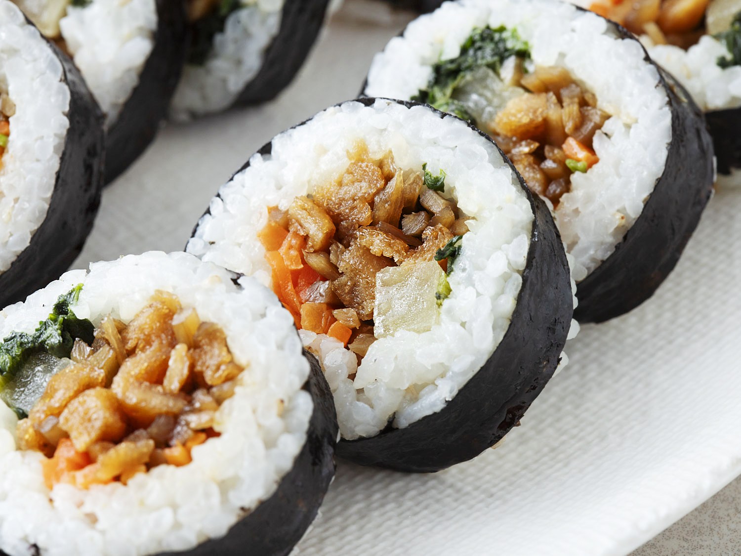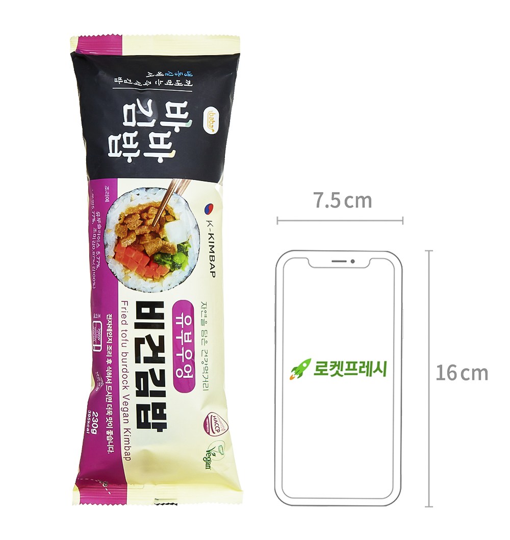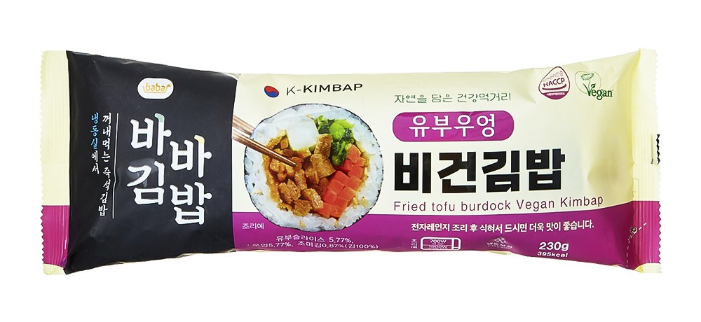 유부슬라이스, 우엉 등 다채로운 재료가 어우러진 비건김밥이에요. 달짝지근하면서 짭조름한 감칠맛이 일품이지요. 정갈하게 썰려 있어 먹기에도 간편하답니다. 출출할 때 간식으로, 간단한 한 끼 식사로 즐겨보세요.