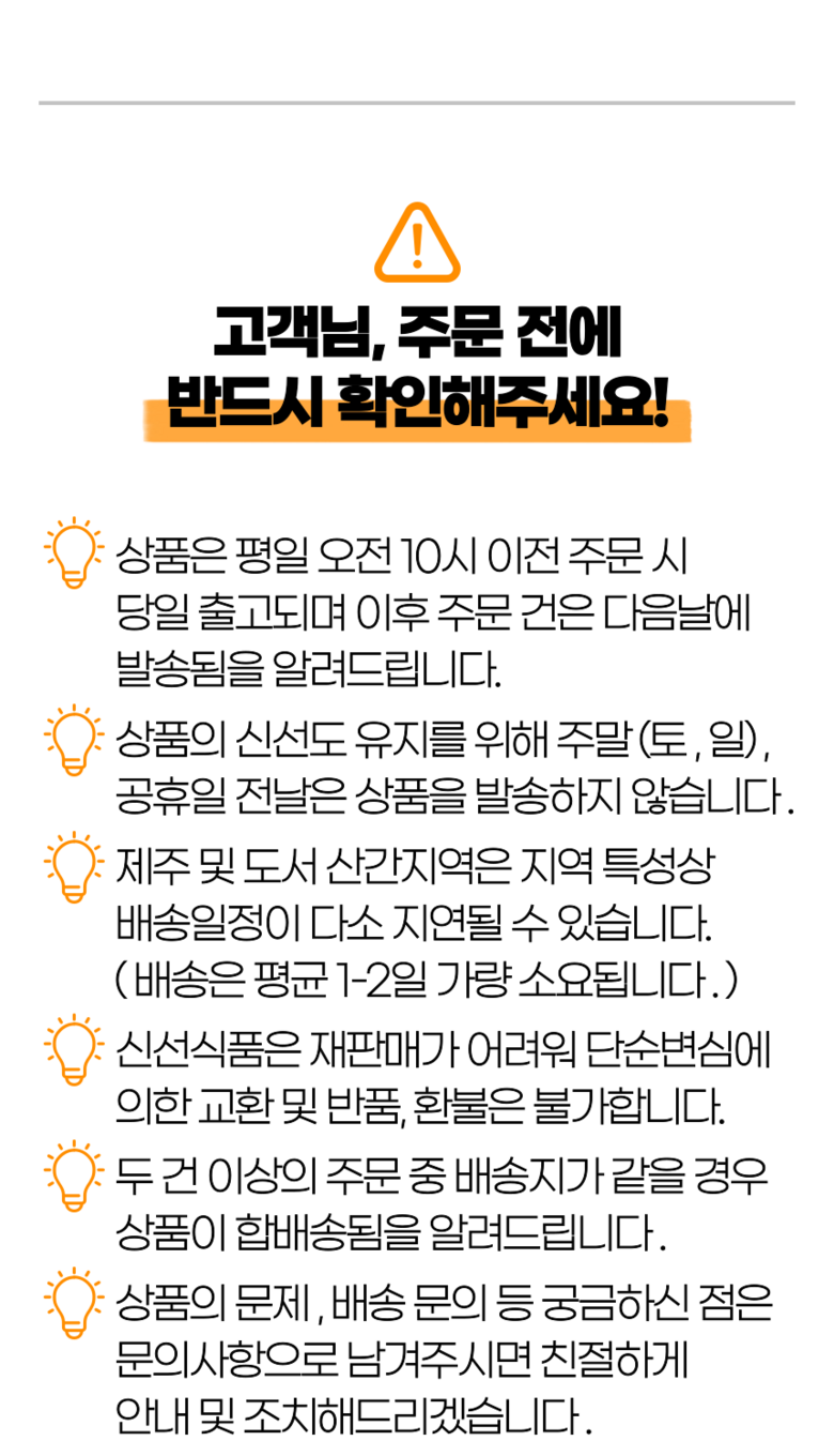 - 보관방법: 신선식품으로 빠른 시일내에 드시는 것을 권장드립니다.