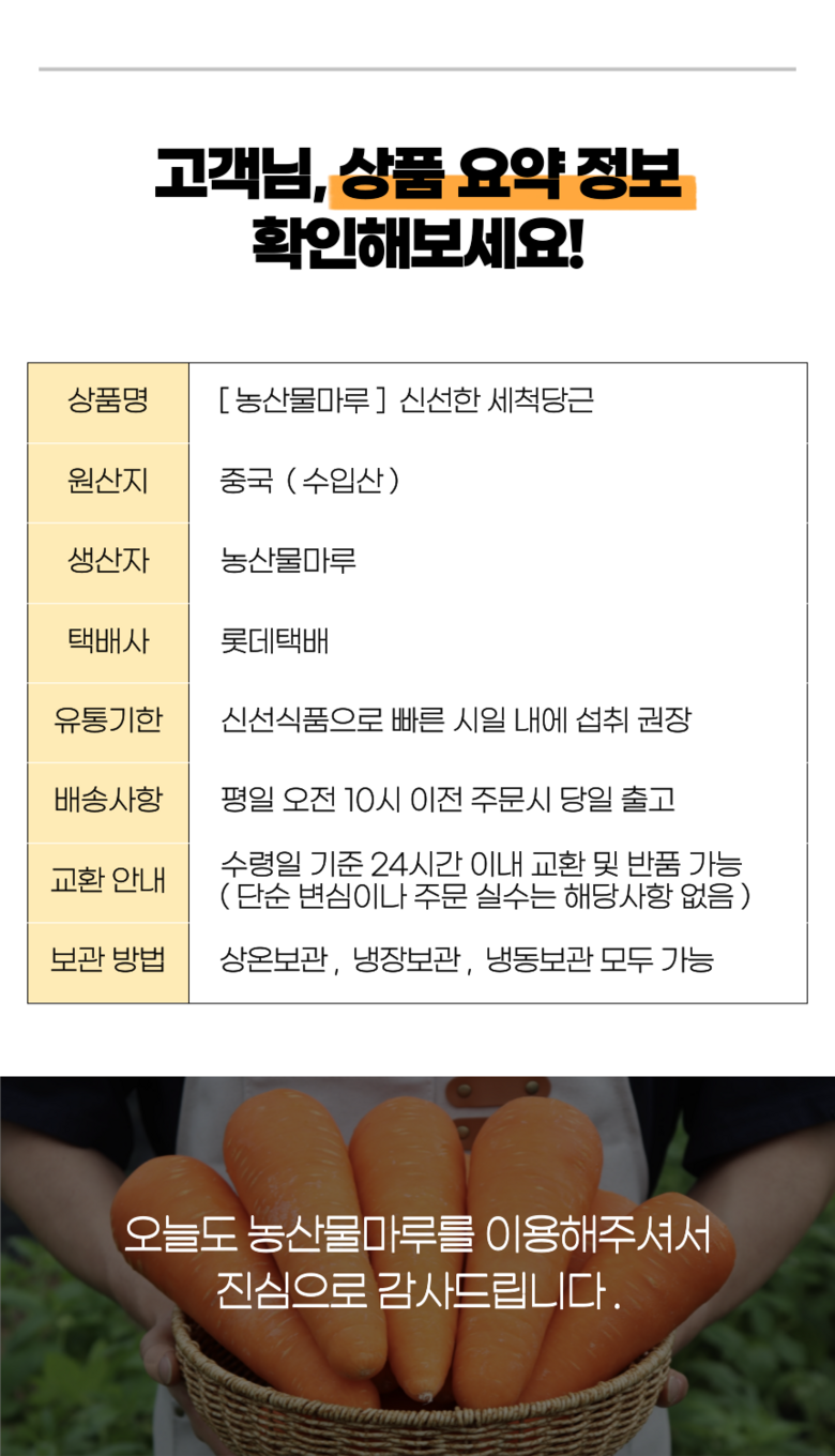 | 품목 또는 명칭 | 중국산 세척당근 | 포장단위별 내용물의 용량(중량),수량,크기 | 2kg, 3kg, 5kg, 10kg |