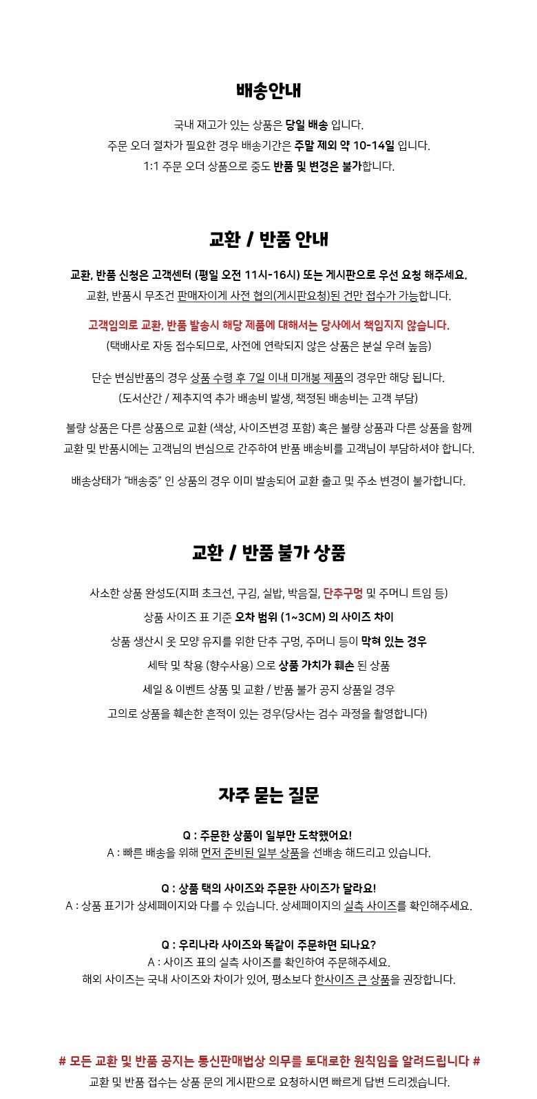 - ㆍ교환/반품에 관한 일반적인 사항은 판매자가 제시사항보다 관계법령이 우선합니다.
