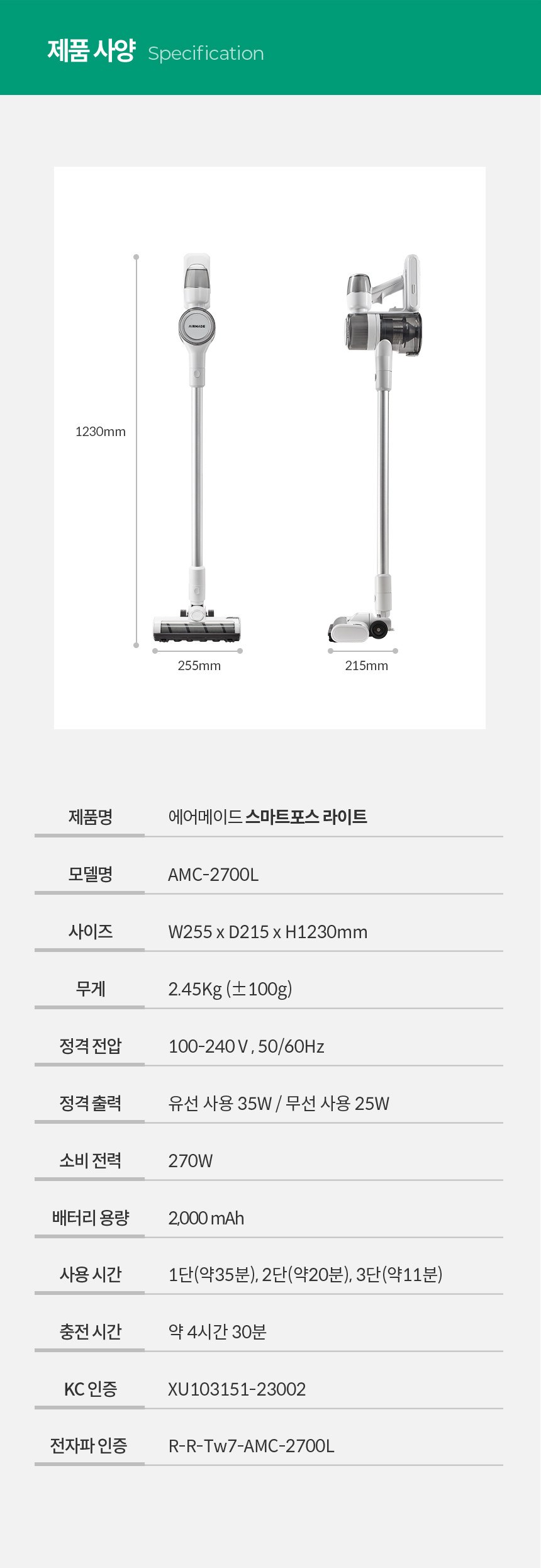 | 품명 및 모델명 | Vacuum Cleaner / AMC-2700L | KC 인증정보 | 본품: R-R-Tw7-AMC-2700L /충전기:HU072903-21004A, R-R-C88-CS13A270050FKF /전지: XU103151-23002A |