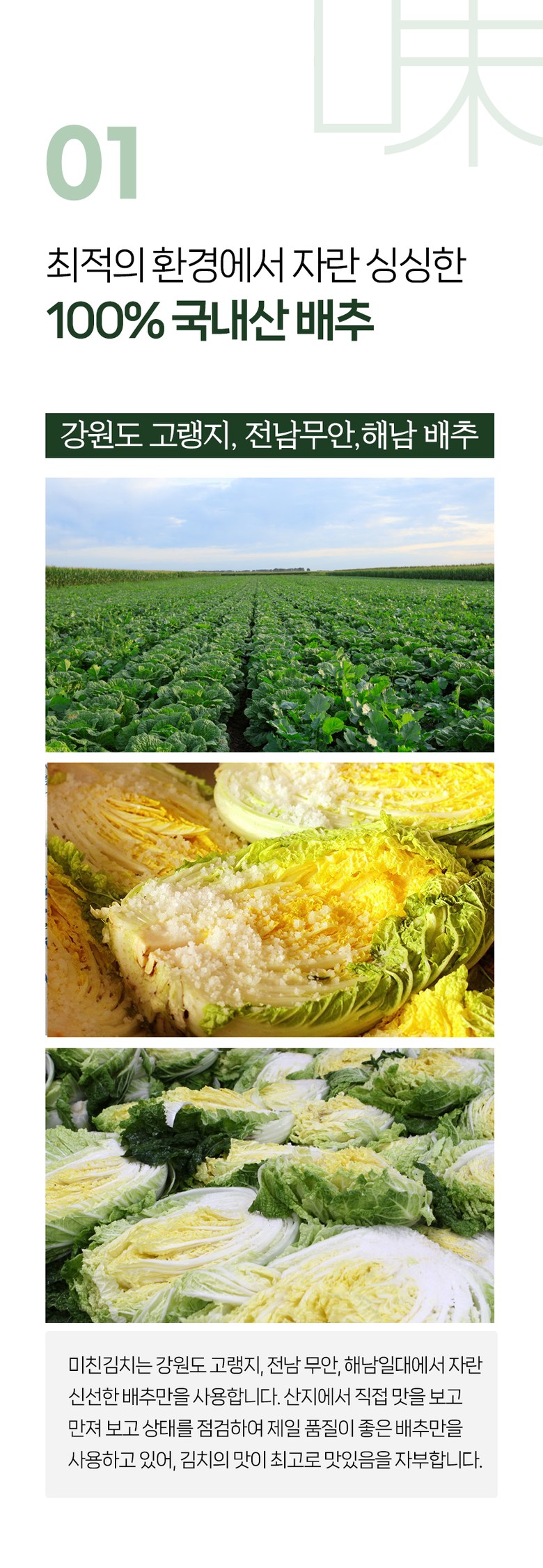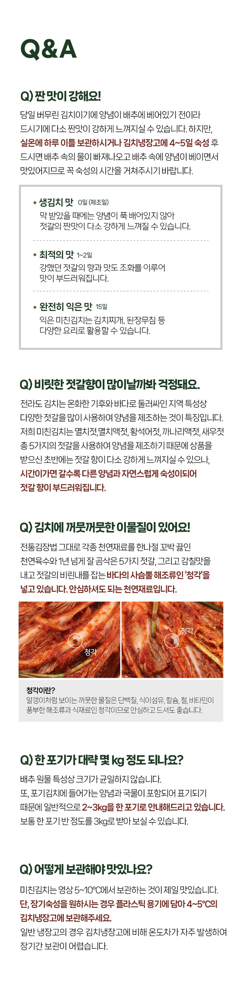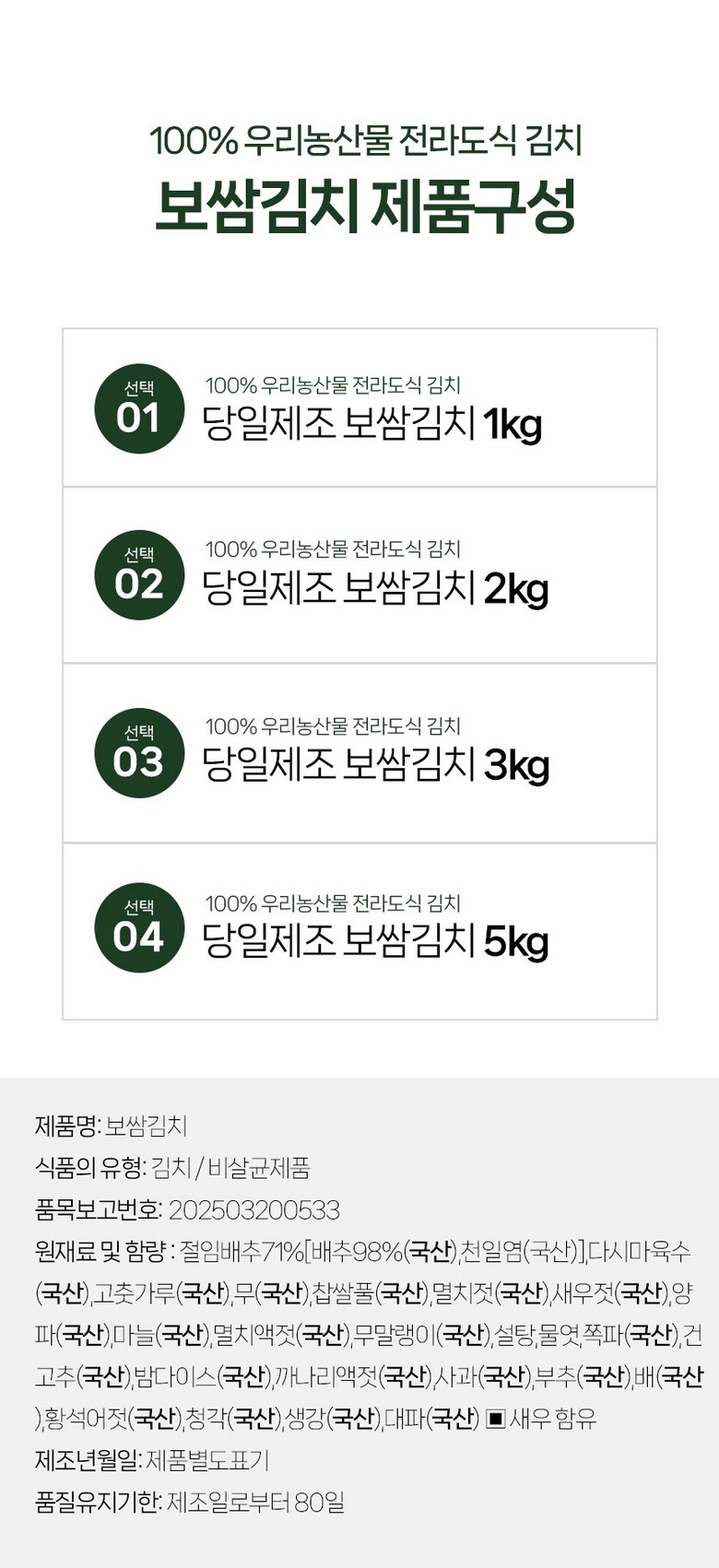 | 포장단위별 내용물의 용량(중량), 수량 | 1kg, 2kg, 3kg, 5kg, 1개 | 원재료명 및 함량 | 절임배추71%[배추98%(국산),천일염(국산)],다시마육수(국산),고춧가루(국산),무(국산),찹쌀풀(국산),멸치젓(국산),새우젓(국산),양파(국산),마늘(국산),멸치액젓(국산),무말랭이(국산),설탕,물엿,쪽파(국산),건고추(국산),밤다이스(국산),까나리액젓(국산),사과(국산),부추(국산),배(국산),황석어젓(국산),청각(국산),생강(국산),대파(국산) ▣새우함유 |