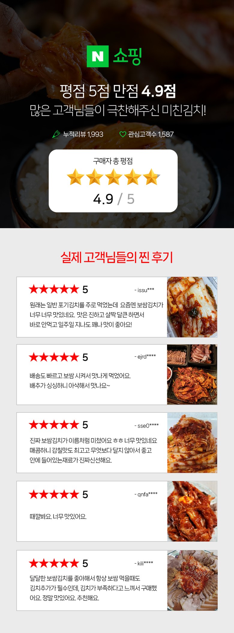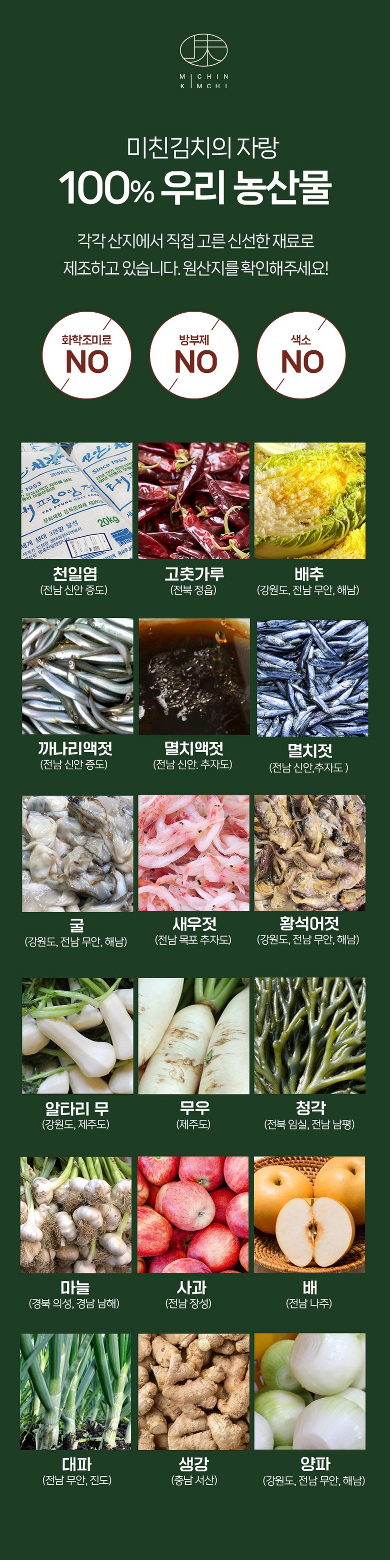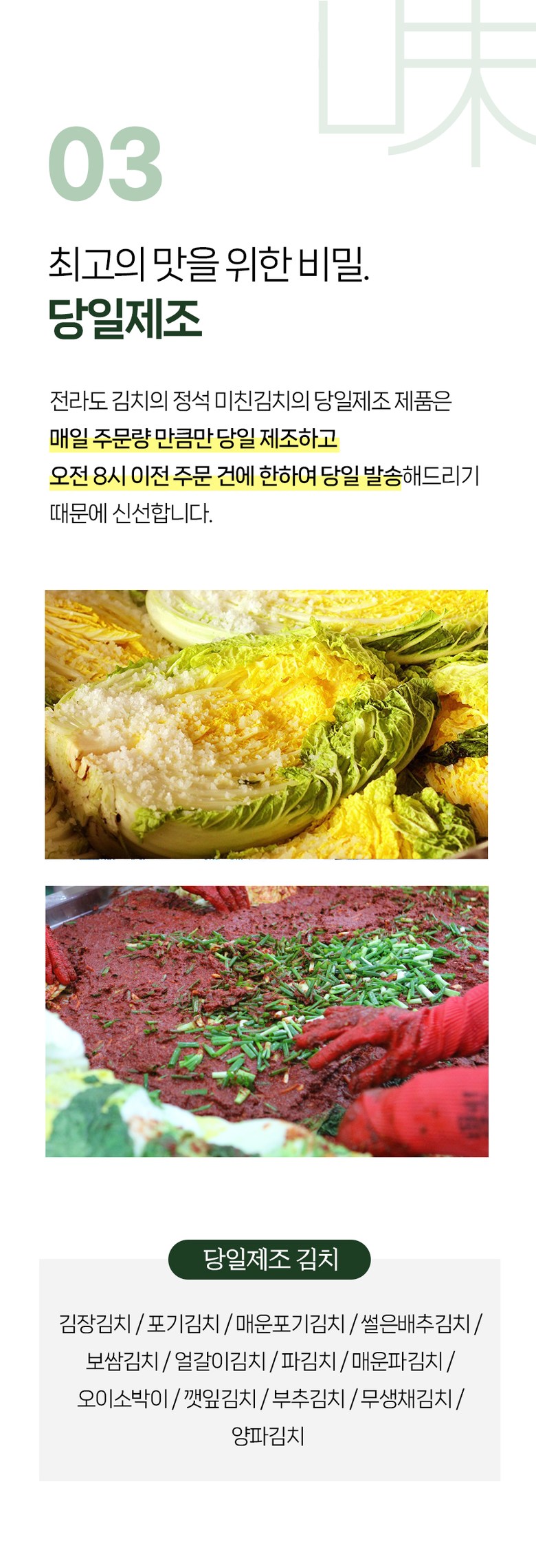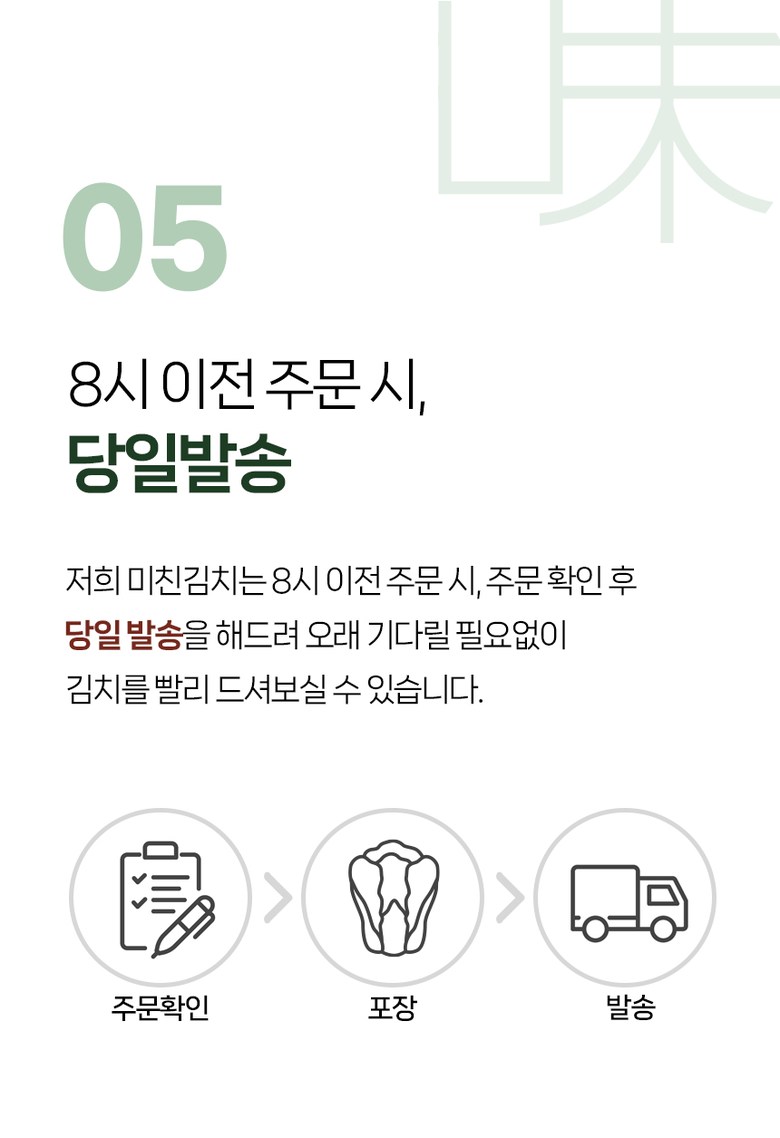 | 포장단위별 내용물의 용량(중량), 수량 | 1kg, 2kg, 3kg, 5kg, 1개 | 원재료명 및 함량 | 절임배추71%[배추98%(국산),천일염(국산)],다시마육수(국산),고춧가루(국산),무(국산),찹쌀풀(국산),멸치젓(국산),새우젓(국산),양파(국산),마늘(국산),멸치액젓(국산),무말랭이(국산),설탕,물엿,쪽파(국산),건고추(국산),밤다이스(국산),까나리액젓(국산),사과(국산),부추(국산),배(국산),황석어젓(국산),청각(국산),생강(국산),대파(국산) ▣새우함유 |
