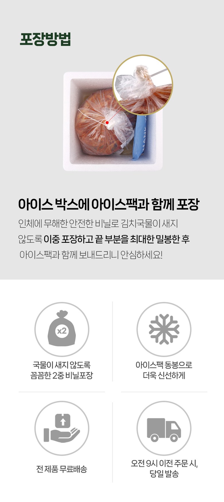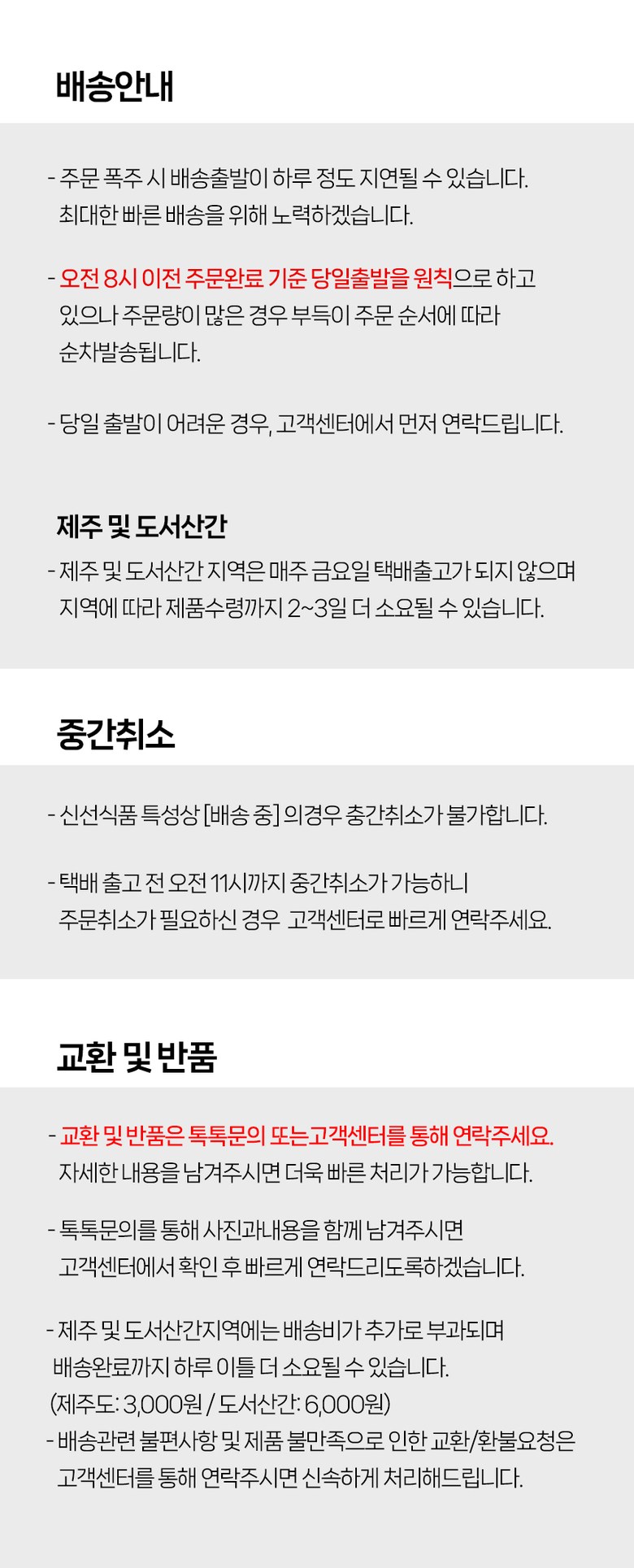 | 배송방법 | 신선/냉장/냉동 | 배송비 | 무료배송 · 도서산간 추가 배송비 - 제주 지역: 400원 - 도서산간 지역: 400원 |