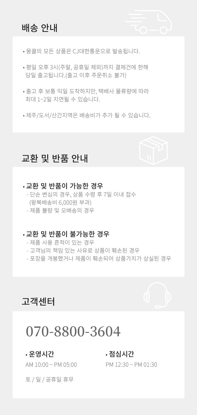 - ㆍ모니터 해상도의 차이로 인해 색상이나 이미지가 실제와 달라, 고객이 단순 변심으로 교환/반품을 무료로 요청하는 경우