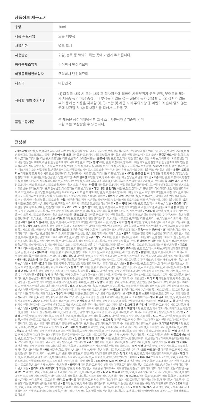 | 사용기한 또는 개봉 후 사용기간 | 제품 별도 표시 | 사용방법 | 귀 밑, 손목 등 맥박이 뛰는 곳에 가볍게 뿌려줍니다. |