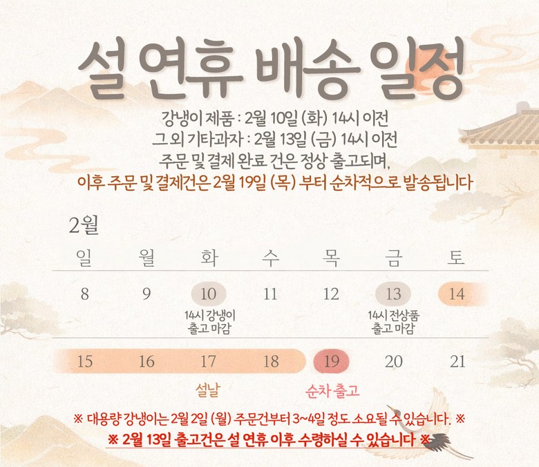 | 배송기간 | ㆍ도서산간 지역 등은 배송에 3-5일이 더 소요될 수 있습니다. - 천재지변, 물량 수급 변동 등 예외적인 사유 발생 시, 다소 지연될 수 있는 점 양해 부탁드립니다. | ||