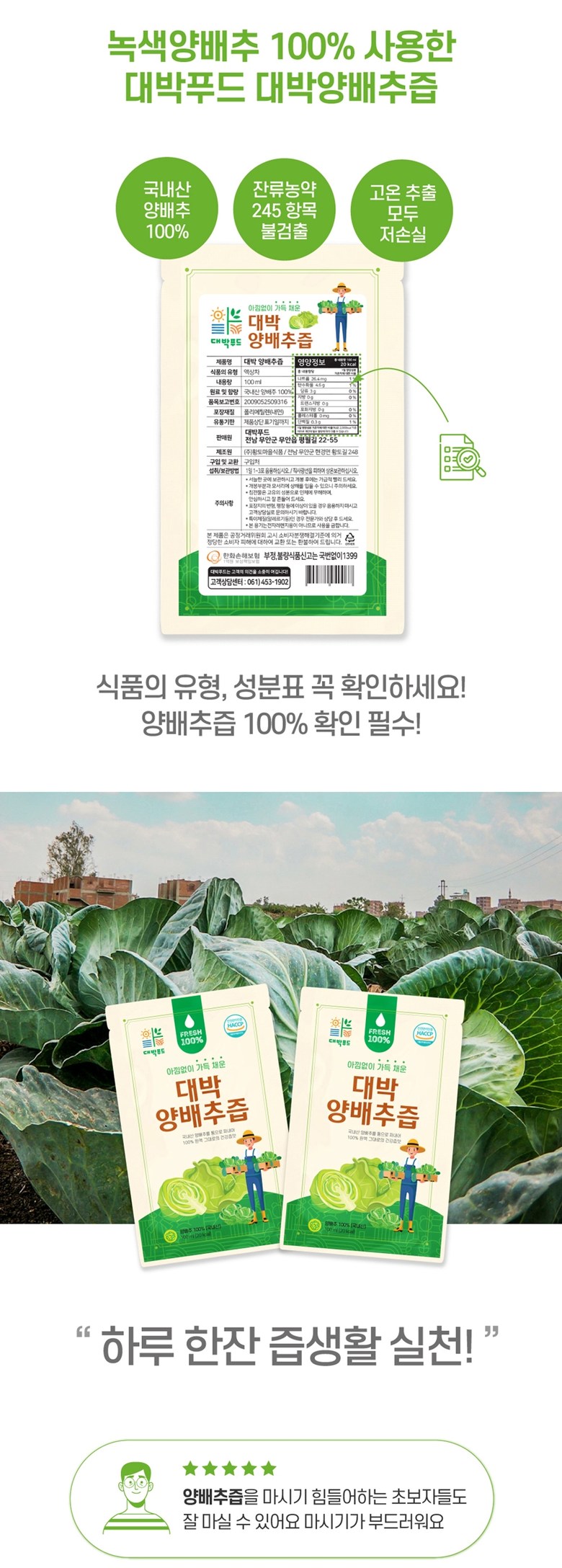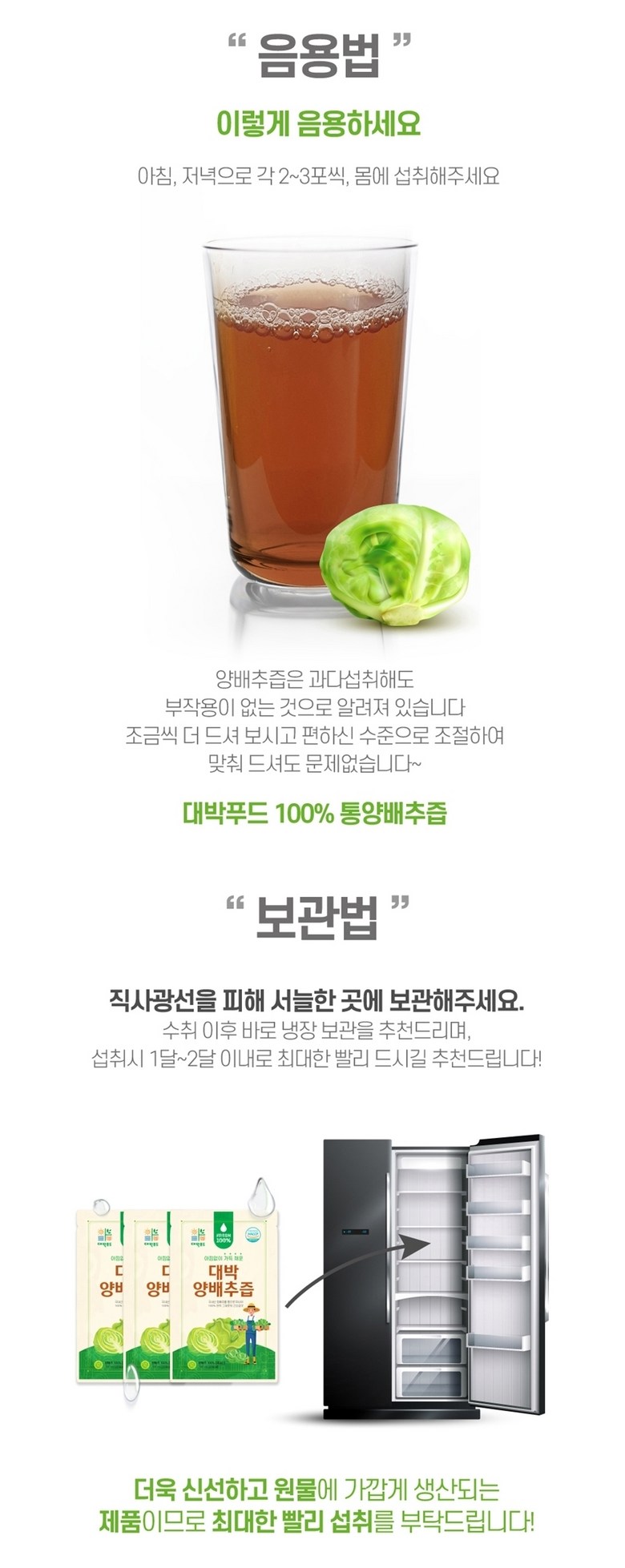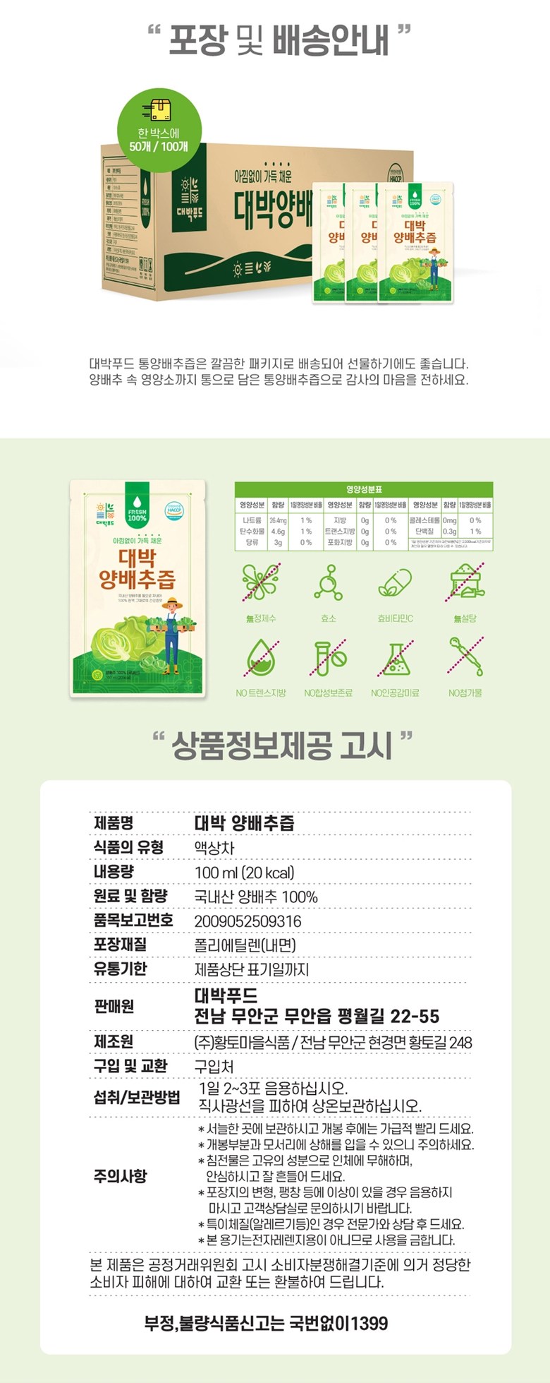 | 포장단위별 내용물의 용량(중량), 수량 | 1포당 100ml | 원재료명 및 함량 | 양배추100% |