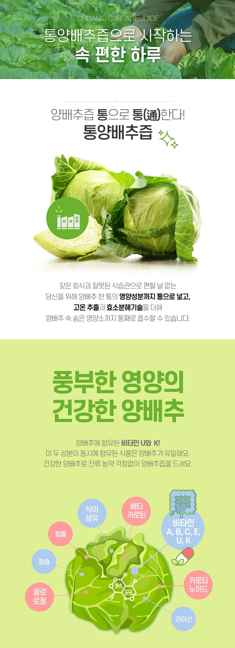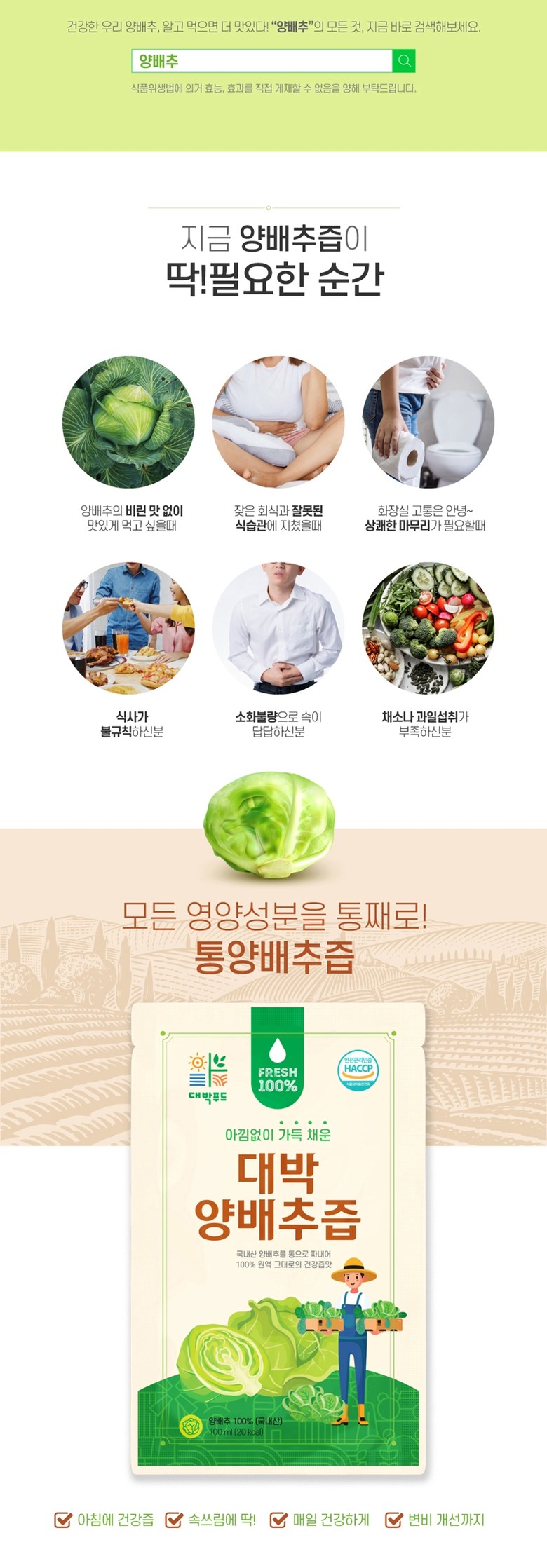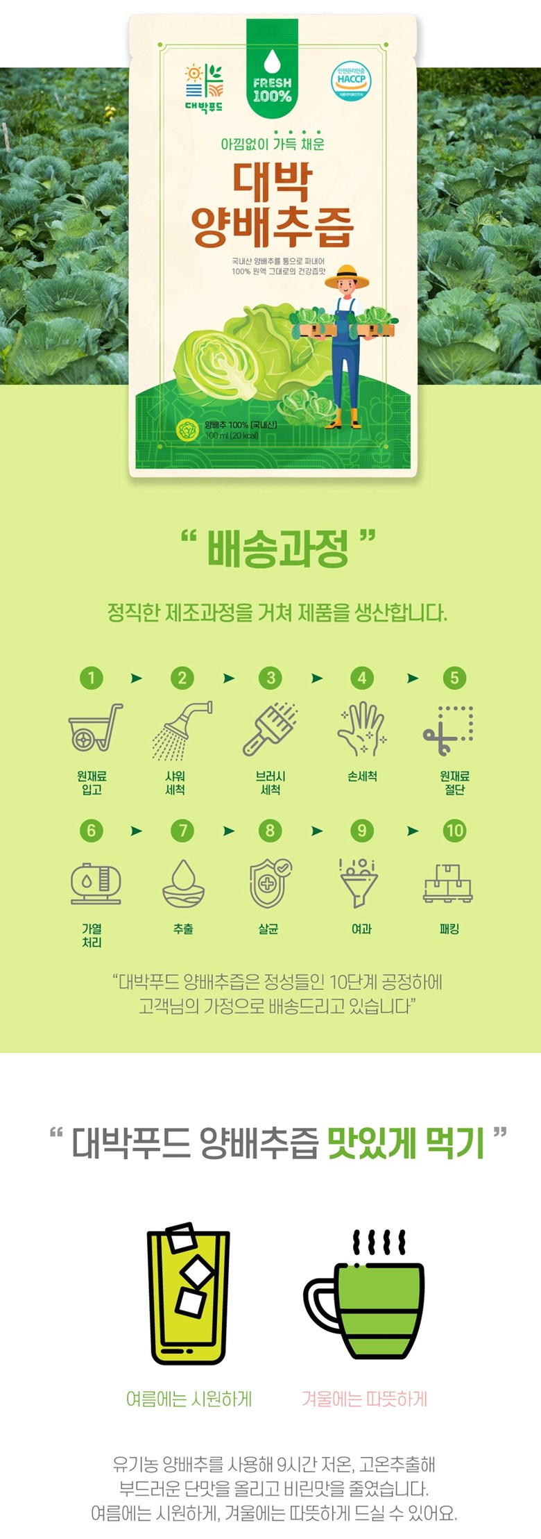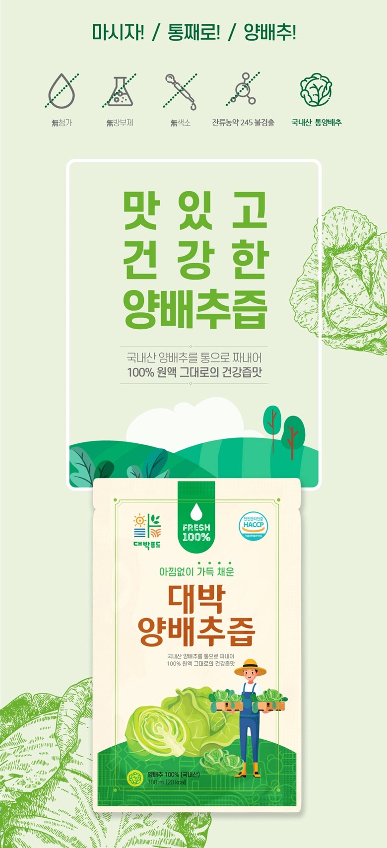 | 포장단위별 내용물의 용량(중량), 수량 | 1포당 100ml | 원재료명 및 함량 | 양배추100% |