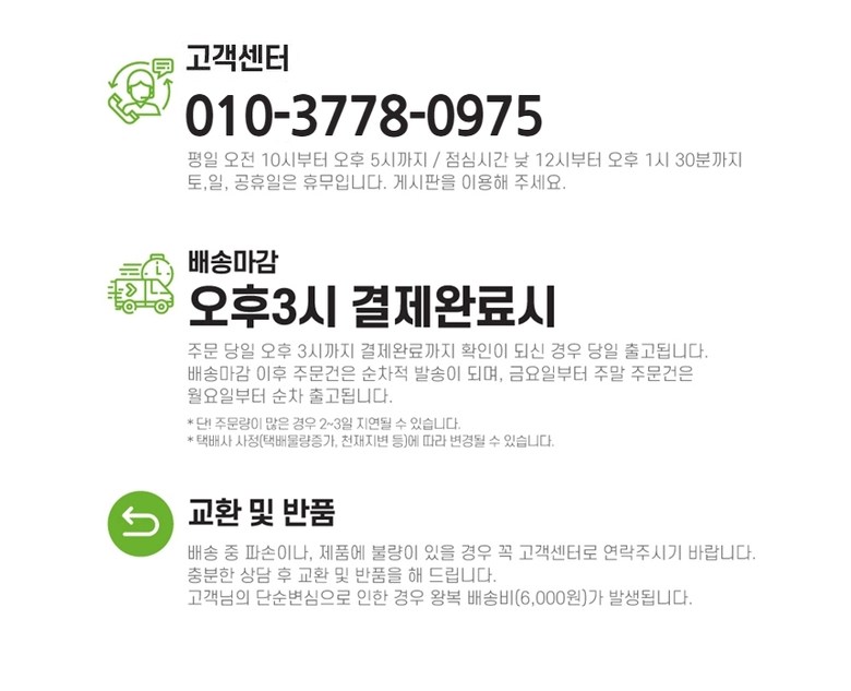| 교환/반품 비용 (왕복비용) | 6,000원 - 단, 고객 변심의 경우에만 발생 - 도서산간 및 일부 지역 추가비용 발생 |