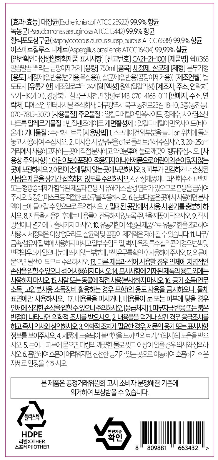 | 품목 및 제품명 | 세정제, 살균제 /쉼표365 깔끔말끔 뿌리는 곰팡이제거제 | 용도(표백제의 경우 계열을 함께표시) 및 제형 | 살균제-일반용(곰팡이제거용) ,세정제-일반용(욕실용,변기용) / 분무기형 |