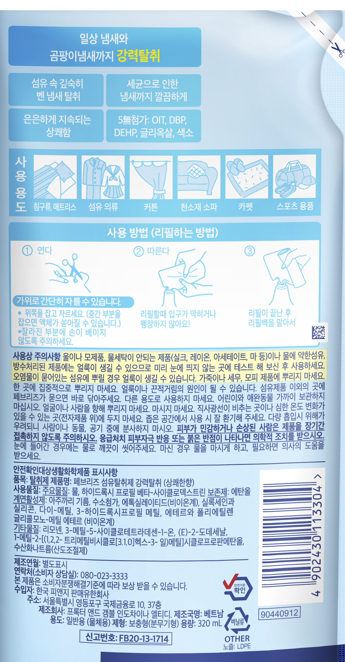 | 품목 및 제품명 | 탈취제 / 페브리즈 섬유탈취제 강력탈취 (상쾌한향) | 용도(표백제의 경우 계열을 함께표시) 및 제형 | 일반용-물체용 / 보충형(분무기형) |