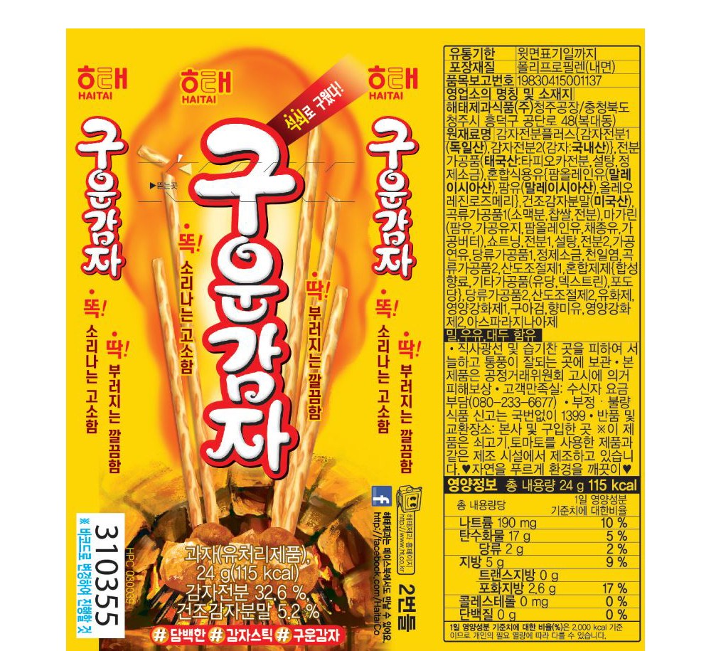 | 제품명 | 구운감자 | 식품의 유형 | 과자(유처리제품) |