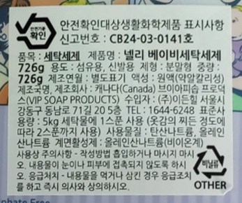 | 품목 및 제품명 | 세탁세제/넬리 베이비 세탁세제 726g | 용도(표백제의 경우 계열을 함께표시) 및 제형 | 섬유용,신발용/비분사형-분말형 |