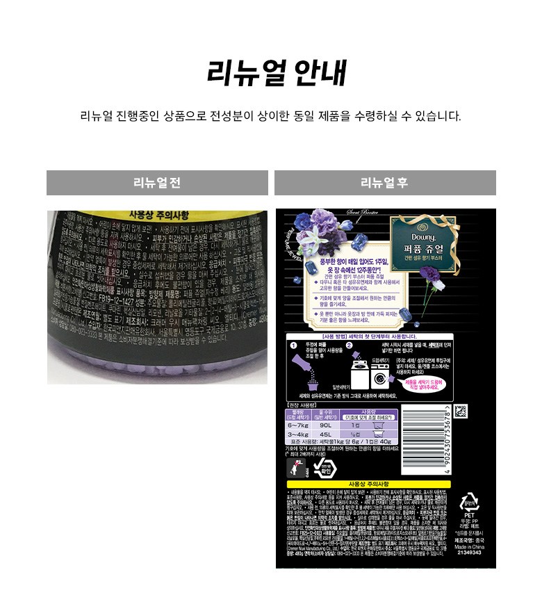 | 품목 및 제품명 | 방향제ㅣ리뉴얼 전 : 퍼퓸 쥬얼(자수정 베리) / 리뉴얼 후 : 다우니 퍼퓸 쥬얼(자수정 베리) | 용도(표백제의 경우 계열을 함께표시) 및 제형 | 일반용 (섬유용) / 고체형 |