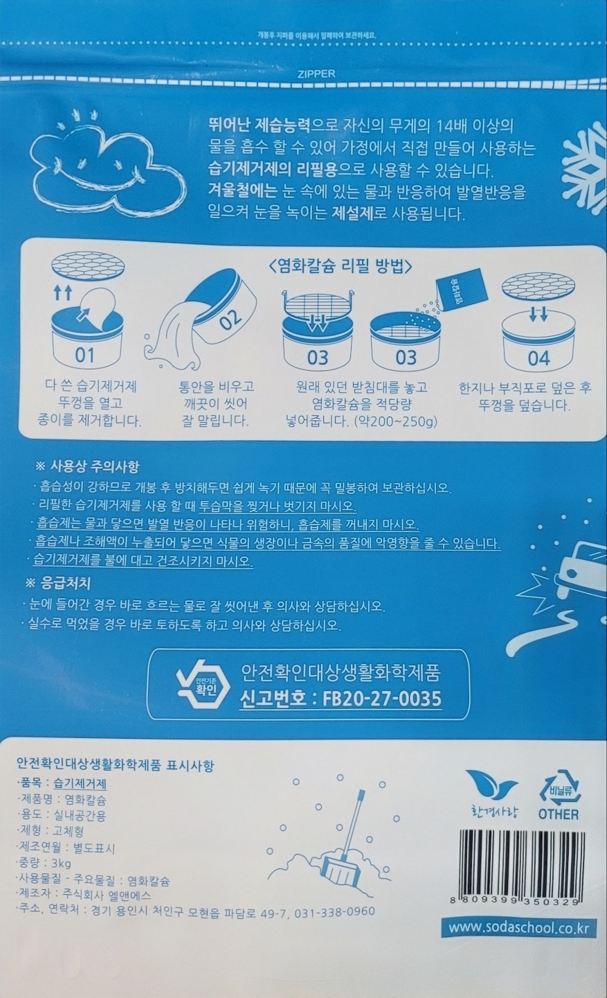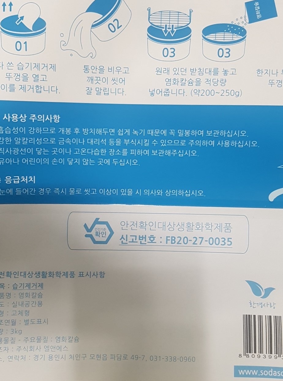 | 품목 및 제품명 | 일반생활화학제품(습기제거제) / 염화칼슘 | 용도(표백제의 경우 계열을 함께표시) 및 제형 | [용도]실내공간용 / [제형]고체형 |