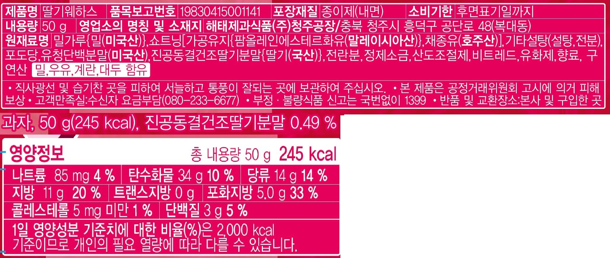 | 제품명 | 딸기웨하스 | 식품의 유형 | 과자 |