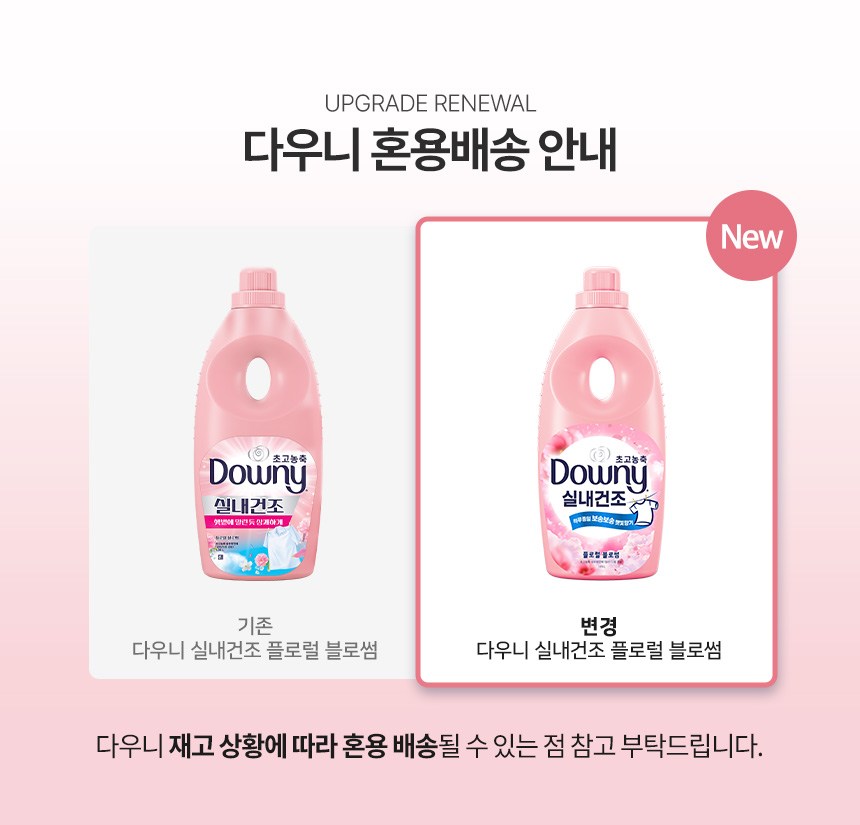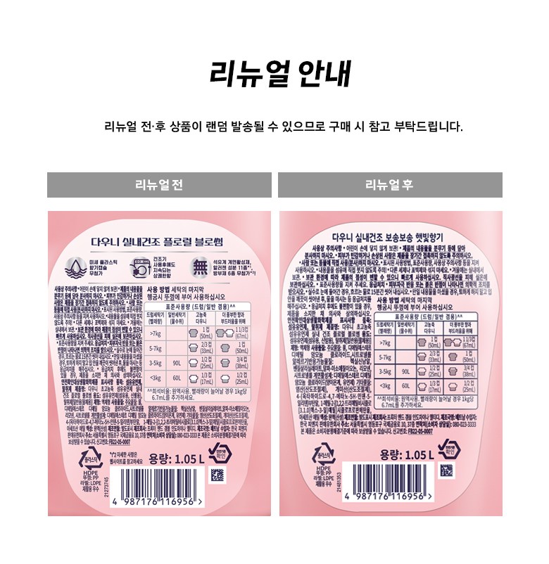 | 품목 및 제품명 | 섬유유연제, 탈취제 / 다우니 초고농축 섬유유연제 실내 건조 플로럴 블로썸 | 용도(표백제의 경우 계열을 함께표시) 및 제형 | 섬유유연제(섬유용, 신발용), 탈취제[일반용(물체용)] / 액체형 |