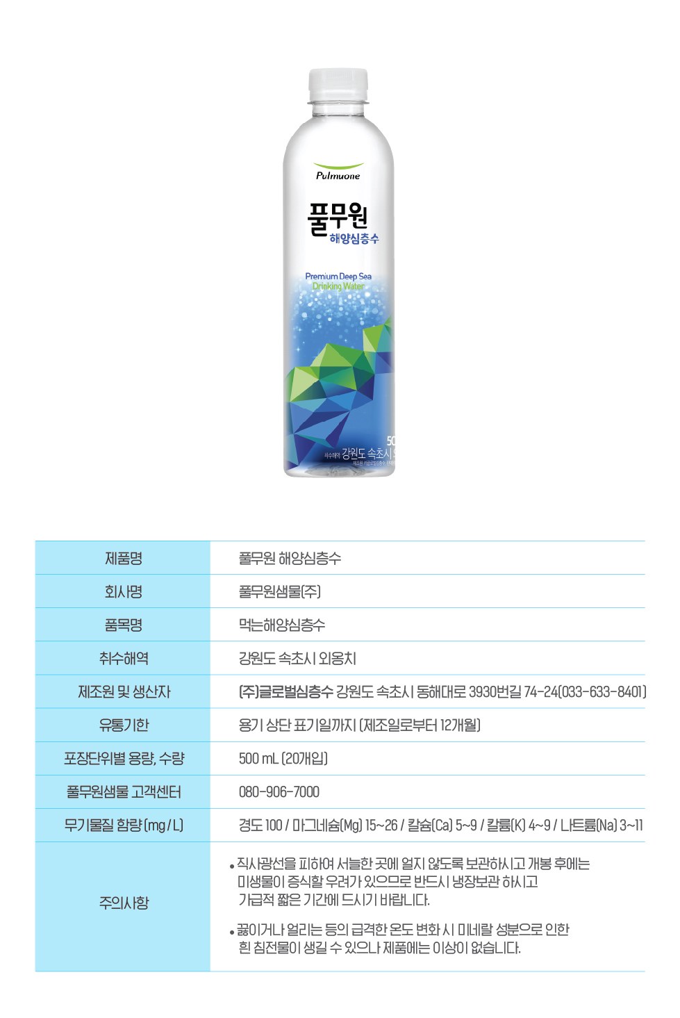 | 제품명 | 풀무원 해양심층수 | 식품의 유형 | 컨텐츠 참조 |